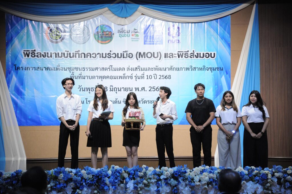 สำหรับพิธีลงนามบันทึกความร่วมมือ (MoU) และพิธีส่งมอบโครงการสมาคมเพื่อนชุมชนธรรมศาสตร์โมเดลฯ รุ่นที่ 10 ปีนี้เป็นการพัฒนายกระดับศักยภาพ (วสช.) ซึ่งถือเป็นเศรษฐกิจฐานรากของจังหวัดระยอง ที่ผ่านมา ได้ดำเนินการไปแล้วตั้งแต่ปี 2559-2567 มีผลสัมฤทธิ์ในการพัฒนา วสช. ไปแล้วทั้งหมด 9 รุ่น รวม 64 กลุ่มวิสาหกิจ สร้างรายได้สะสมกว่า 108 ล้านบาท โดยปีนี้ มีกลุ่มวิสาหกิจชุมชนเข้าร่วมจำนวน 6 กลุ่ม ประกอบด้วย