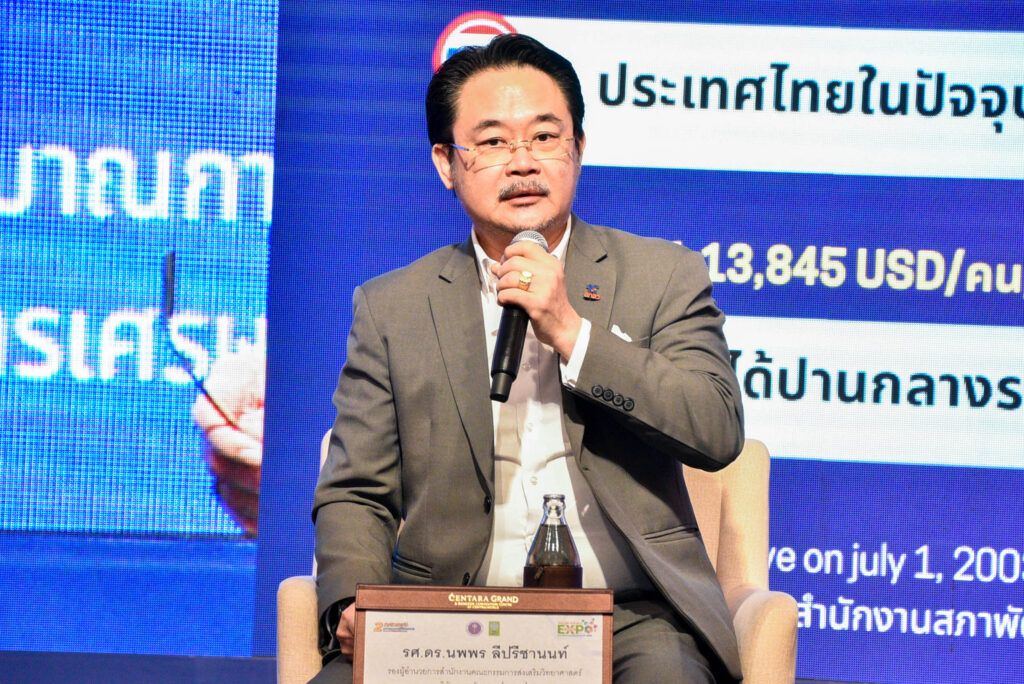 รศ.ดร.นพพร ลีปรีชานนท์ รองผู้อำนวยการสำนักงานคณะกรรมการส่งเสริมวิทยาศาสตร์ วิจัยและนวัตกรรม กล่าวในหัวข้อ “กลไกในการสนับสนุนการพัฒนาบุคลากรวิจัยและนวัตกรรม ในการสร้างเทคโนโลยีชั้นนำเพื่อตอบสนองเป้าหมาย SDGs” ว่า การขับเคลื่อนเป้าหมาย SDGs จำเป็นต้องอาศัยบุคลากรที่มีความรู้ความสามารถเฉพาะทาง โดยเฉพาะด้าน AI หุ่นยนต์ และพลังงานสะอาด (สกสว.) จึงสนับสนุนทุนวิจัยและทุนพัฒนาศักยภาพนักวิจัยรุ่นใหม่อย่างต่อเนื่อง ทั้งในระดับปริญญาเอกและหลังปริญญา นอกจากนี้ ยังเร่งสร้างเครือข่ายความร่วมมือกับสถาบันวิจัยระดับนานาชาติ เพื่อเปิดโอกาสให้นักวิจัยไทยได้แลกเปลี่ยนองค์ความรู้กับนักวิจัยชั้นนำทั่วโลก พร้อมผลักดันให้เกิดการวิจัยแบบบูรณาการที่สามารถนำไปใช้ประโยชน์ได้จริง และมีผลกระทบเชิงบวกต่อสังคมและสิ่งแวดล้อม