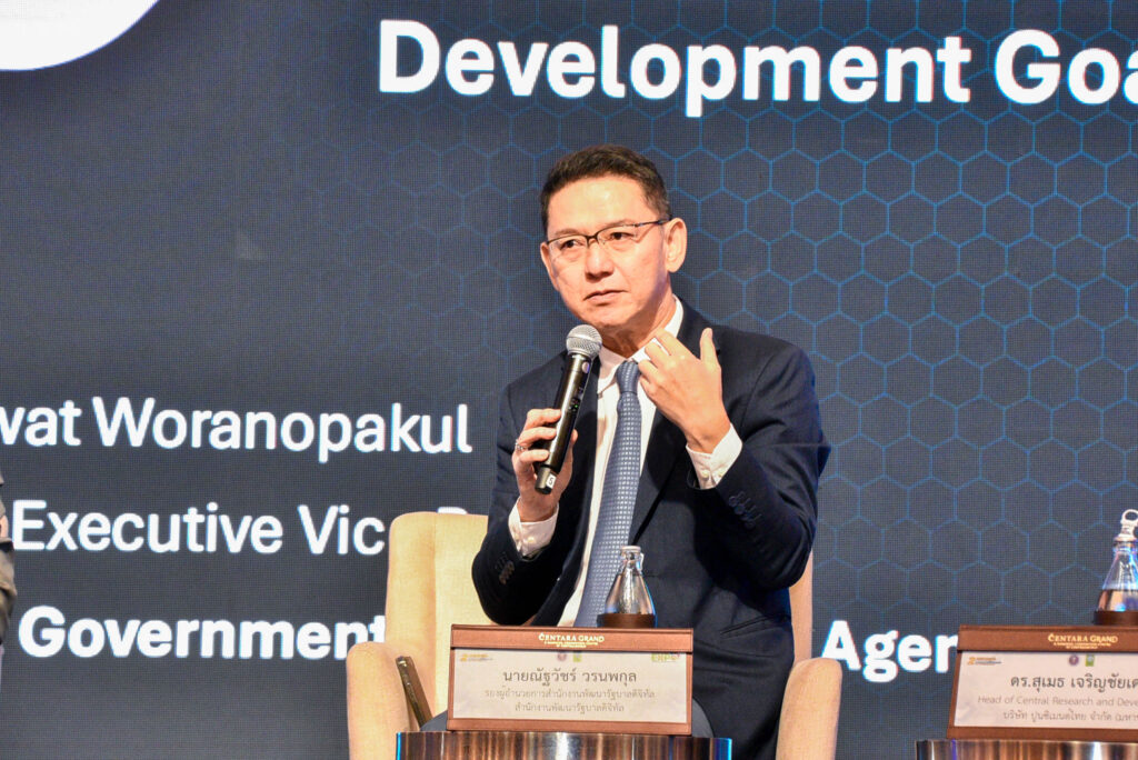 ภายในเวทีเสวนา ยังได้รับเกียรติจากวิทยากรผู้ทรงคุณวุฒิจากหลายภาคส่วน ได้แก่ นายณัฐวัชร์ วรนพกุล รองผู้อำนวยการสำนักงานพัฒนารัฐบาลดิจิทัล ดร.สุเมธ เจริญชัยเดช Head of Central Research and Development บริษัท เอสซีจี เคมิคอลส์ จำกัด มหาชน คุณนารีรัตน์ พันธุ์มณี ผู้อำนวยการศูนย์วิจัยการเปลี่ยนแปลงสภาพภูมิอากาศและสิ่งแวดล้อม ร่วมกล่าวในหัวข้อ “การพัฒนาบุคลากรวิจัยและนวัตกรรมในการขับเคลื่อนประเด็น Climate Change และ AI เพื่อตอบสนองเป้าหมาย SDGs” โดยสรุปว่า การสร้างบุคลากรให้สามารถเข้าใจทั้งระบบเทคโนโลยีและบริบทสิ่งแวดล้อมเป็นกุญแจสำคัญในการเปลี่ยนผ่านประเทศสู่สังคมคาร์บอนต่ำ และการบริหารจัดการข้อมูลด้วย AI ที่มีความแม่นยำสูงจะเป็นตัวช่วยในการตัดสินใจเชิงนโยบายและลดความเหลื่อมล้ำทางเทคโนโลยีได้อย่างยั่งยืน