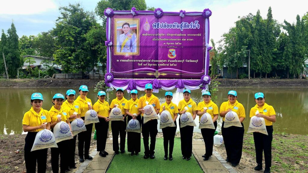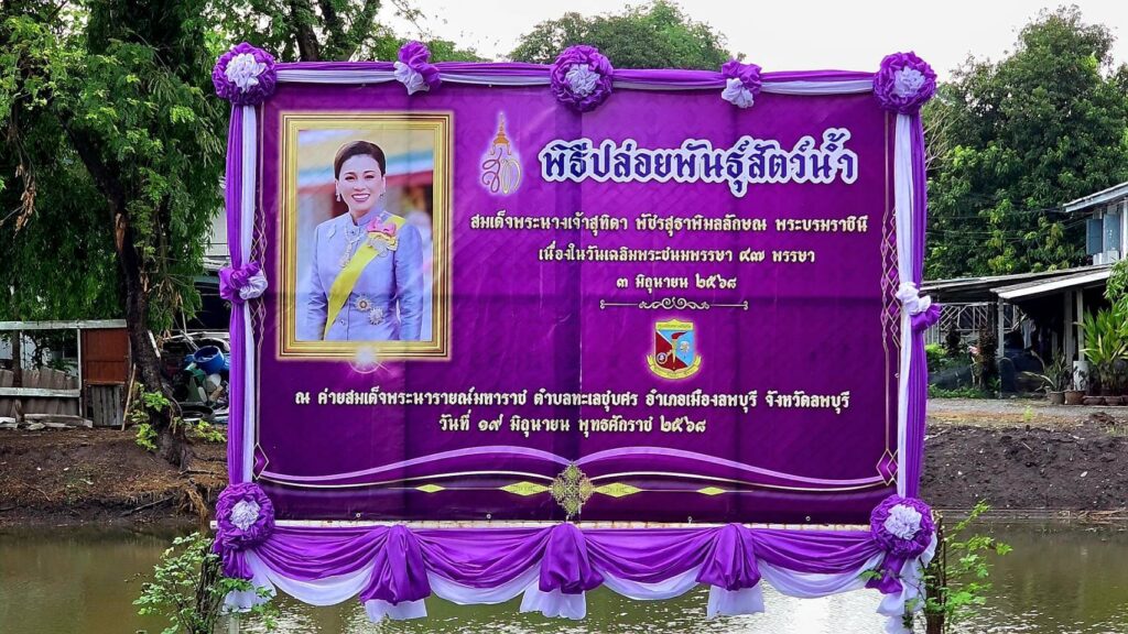 พล.ต. พรเทพ ยังรักษา ผู้บัญชาการศูนย์สงครามพิเศษ (ศสพ.) ค่ายสมเด็จพระนารายณ์มหาราช เป็นประธาน นำข้าราชการกำลัง พร้อมด้วย คณะสมาคมแม่บ้านทหารบก สาขา ศูนย์สงครามพิเศษ และประชาชนจิตอาสาจากพื้นที่ ชุมชนรอบค่ายฯ รวมกว่า 200 คน ร่วมถวายราชสดุดีเฉลิมพระเกียรติ ต่อเบื่องหน้าพระบรมฉายาลักษณ์ สมเด็จพระนางเจ้าสุทิดา พัชรสุธาพิมลลักษณ พระบรมราชินี พร้อมเปิด กิจกรรม “จิตอาสาพัฒนา” เนื่องในโอกาส เดือนแห่งมหามงคล เฉลิมพระชนมพรรษา 47 พรรษา ณ บ่อเก็บน้ำข้างอาคารชุด กองพันรบพิเศษ ศูนย์สงครามพิเศษ ภายในค่ายสมเด็จพระนารายณ์มหาราช โดยกำลังพลของหน่วยได้ร่วมกัน ปล่อยพันธุ์สัตว์น้ำ จำนวน 5,000 ตัว ลงสูงแหล่งน้ำภายในค่ายฯ และร่วมกันปลูกต้นไม้ จำนวน 200 ต้น พร้อมทั้งร่วมพัฒนา เก็บความกวาด ทำความสะอาด ตัดหญ้า กำจัดวัชพืช ปรับภูมิทัศน์ บริเวณสวนสุขภาพ เพื่อเป็นการปรับปรุงทัศนียภาพให้เกิดความสวยงาม น่าอยู่น่ามอง