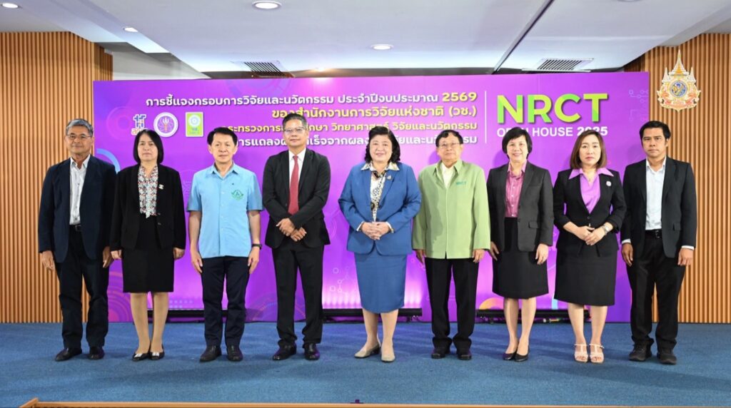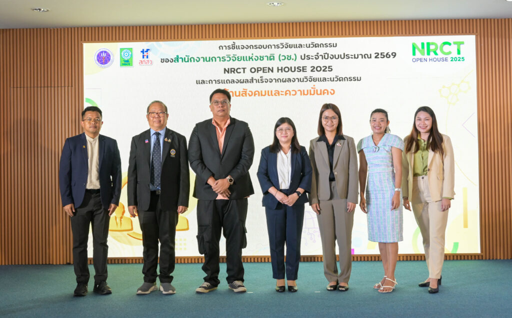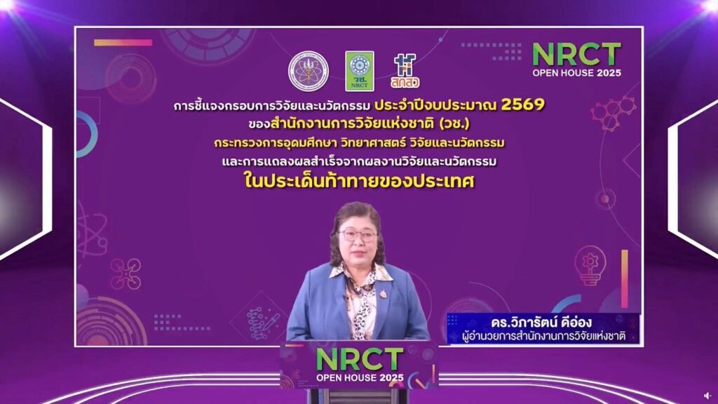 เมื่อวันที่ 23 มิถุนายน พ.ศ.2568 สำนักงานการวิจัยแห่งชาติ (วช.) กระทรวงการอุดมศึกษา วิทยาศาสตร์ วิจัยและนวัตกรรม (อว.) จัดกิจกรรมเปิดบ้านชี้แจงกรอบการวิจัยและนวัตกรรม ประจำปีงบประมาณ 2569 (NRCT Open House 2025) และการแถลงผลสำเร็จจากผลงานวิจัยและนวัตกรรม “ด้านสังคมและความมั่นคง” เพื่อประชาสัมพันธ์การรับข้อเสนอการวิจัยและนวัตกรรม และกรอบการวิจัยและนวัตกรรม ประจำปีงบประมาณ 2569 โดยมี ดร.วิภารัตน์ ดีอ่อง ผู้อำนวยการสำนักงานการวิจัยแห่งชาติ เป็นประธานเปิดงาน ณ ห้องประชุมจอมพลสฤษดิ์ ธนะรัชต์ ชั้น 2 อาคาร วช.1