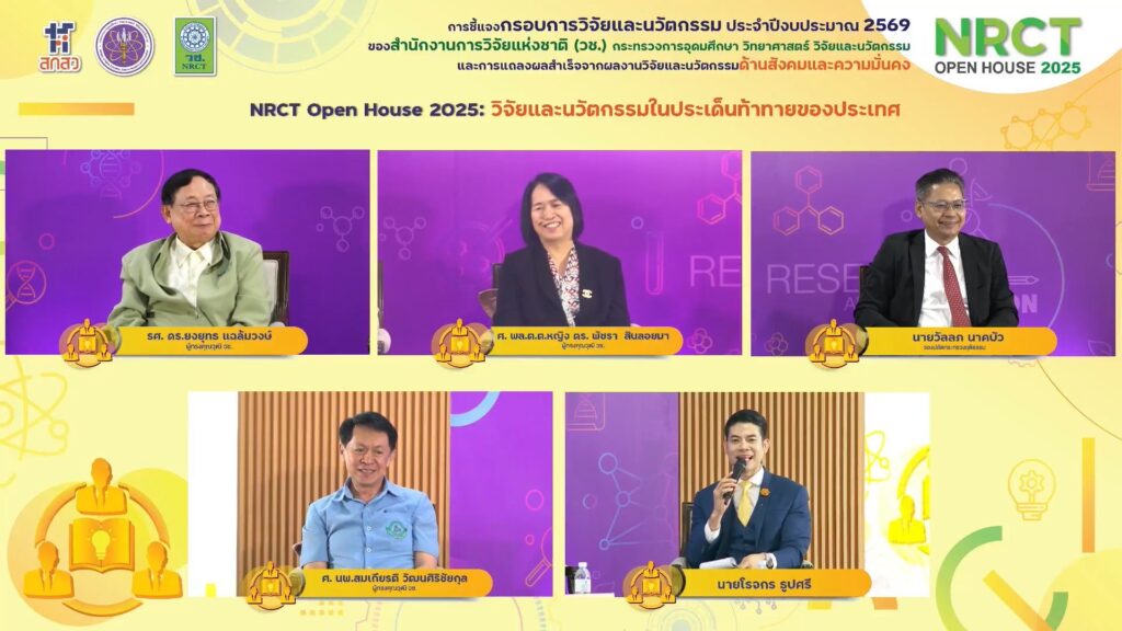 การจัดกิจกรรมเปิดบ้านชี้แจงกรอบการวิจัยและนวัตกรรมของ (วช.) ประจำปีงบประมาณ 2569 และการแถลงผลสำเร็จจากผลงานวิจัยและนวัตกรรม (NRCT Open House 2025) ระหว่างวันที่ 23 มิถุนายน–1 กรกฎาคม 2568 ใน 9 ด้าน ดังนี้ ด้านสังคมและความมั่นคง (23 มิถุนายน 2568) ด้านเศรษฐกิจและการเกษตร (24 มิถุนายน 2568) ด้านการพัฒนาเส้นทางอาชีพนักวิจัยและนวัตกรรม และการวิจัยเพื่อฐานทางวิชาการ (25 มิถุนายน 2568) ด้านสัตว์เศรษฐกิจ (26 มิถุนายน 2568) ด้านการรองรับสังคมสูงวัย (27 มิถุนายน 2568) ด้านการจัดการความรู้การวิจัยและถ่ายทอดเพื่อการใช้ประโยชน์ (KM) (28 มิถุนายน 2568) ด้านการพัฒนาเทคโนโลยีและอุตสาหกรรม (29 มิถุนายน 2568) ด้านการพัฒนาศูนย์รวมผู้เชี่ยวชาญ (Hub of Talents) และศูนย์กลางความรู้ (Hub of Knowledge) (30 มิถุนายน 2568) ด้านทรัพยากรธรรมชาติและสิ่งแวดล้อม (1 กรกฎาคม 2568) ซึ่งจัดในรูปแบบ Onsite ณ ห้องจอมพลสฤษดิ์ ธนะรัชต์ ชั้น 2 อาคาร วช.1 และการถ่ายทอดสดผ่านช่องทางออนไลน์ Facebook LIVE : สำนักงานการวิจัยแห่งชาติ
