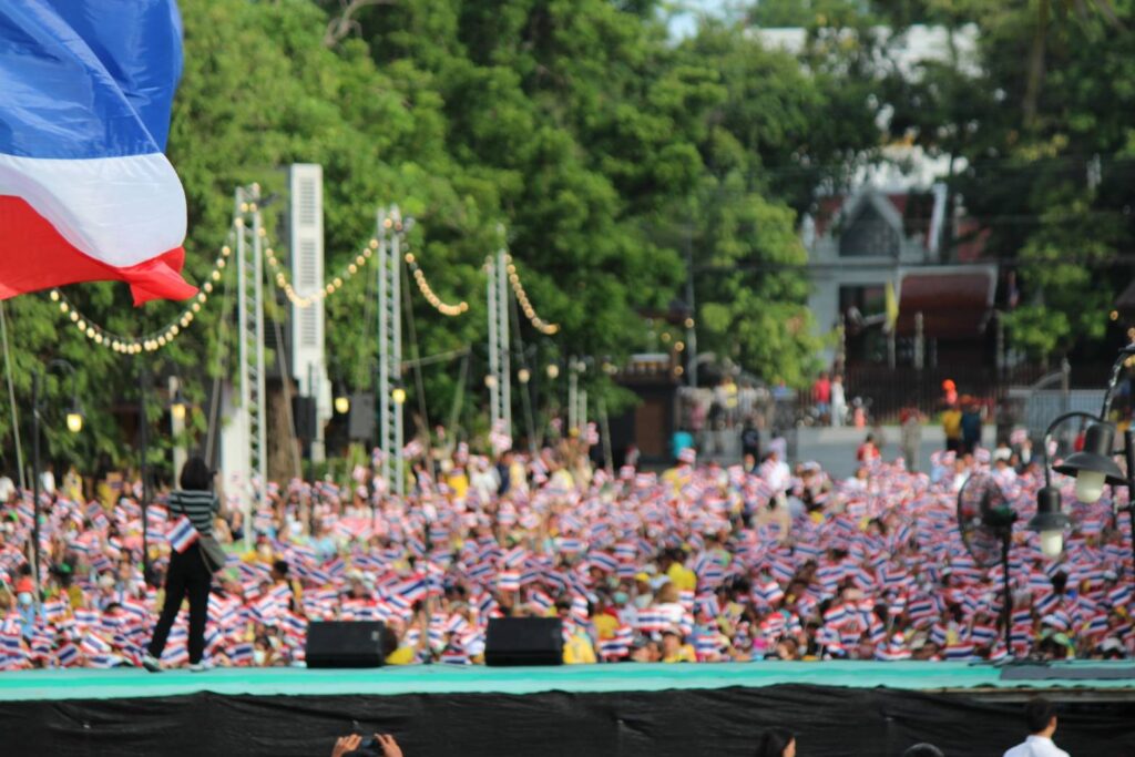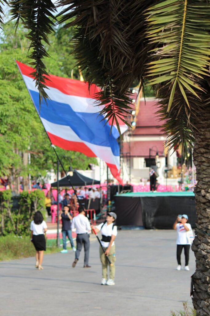 ต่อด้วยการร้องเพลงเคารพธงชาติ และเพลงสรรเสริญพระบารมี โดยมีประชาชนพร้อมใจกันมาแสดงพลังกว่า 2,000 คน ร่วมร้องเพลงชาติไทยกันอย่างกึกก้อง และโบกธงปลิวไสวไปทั่วอนุสาวรีย์วีรชนค่ายบางระจัน