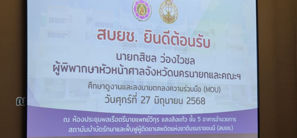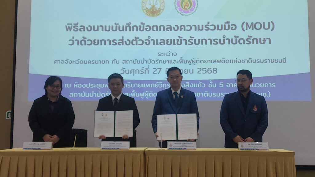 เมือวันที่ 27 มิถุนายน 2568 ที่สถาบันบำบัดรักษาและฟื้นฟูผู้ติดยาเสพติดแห่งชาติบรมราชชนนี (สบยช.) จ.ปทุมธานี ศาลจังหวัดนครนายก และสถาบันบำบัดรักษาและฟื้นฟูผู้ติดยาเสพติดแห่งชาติบรมราชชนนี (สบยช.) โดย นายกสิชล ว่องไวชล ผู้พิพากษาหัวหน้าศาลจังหวัดนครนายก และ นายแพทย์สรายุทธ์ บุญชัยพานิชวัฒนา ผู้อำนวยการสถาบันบำบัดรักษาและฟื้นฟูผู้ติดยาเสพติดแห่งชาติบรมราชชนนี (สบยช.)จัดทำบันทึกข้อตกลง (MOU) ว่าด้วยการส่งตัวจำเลยเข้ารับการบำบัดรักษา