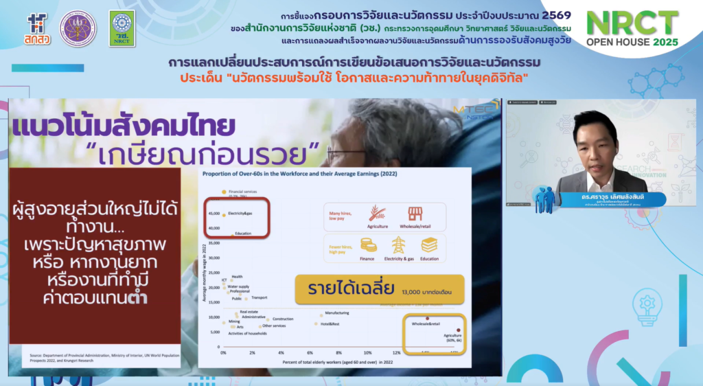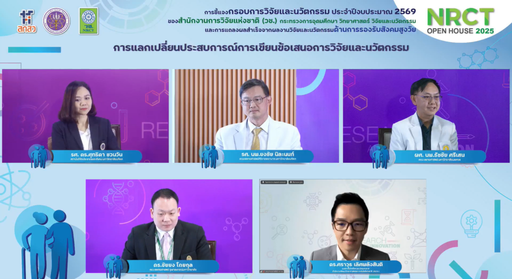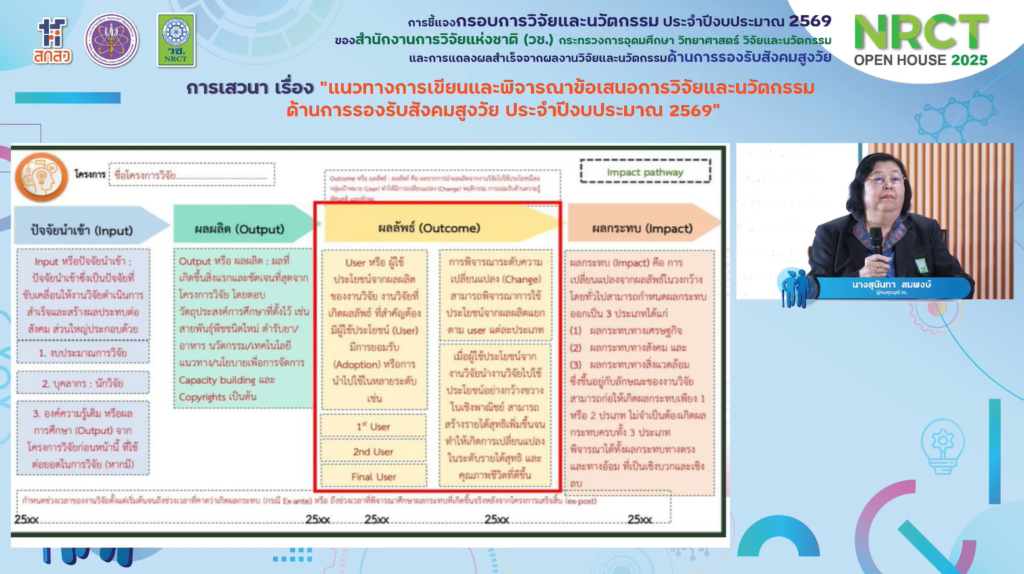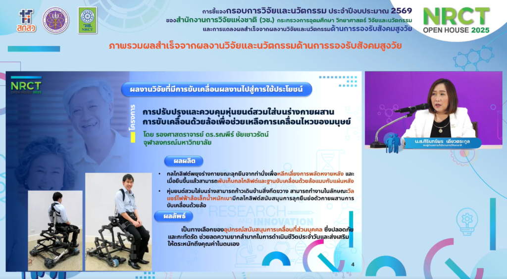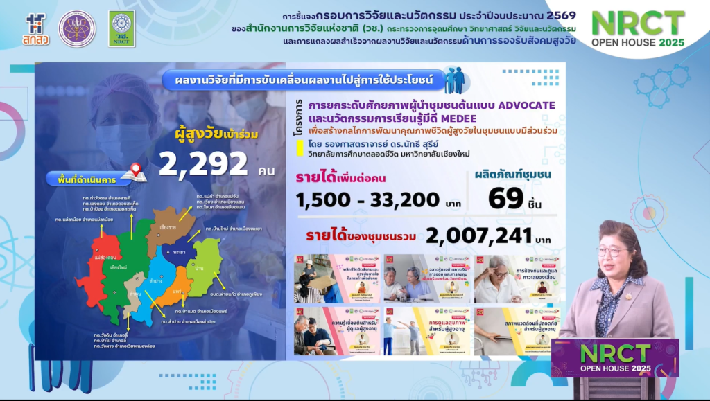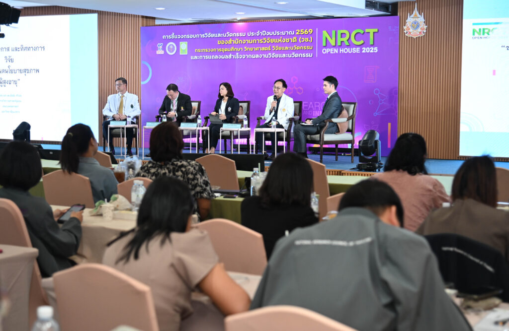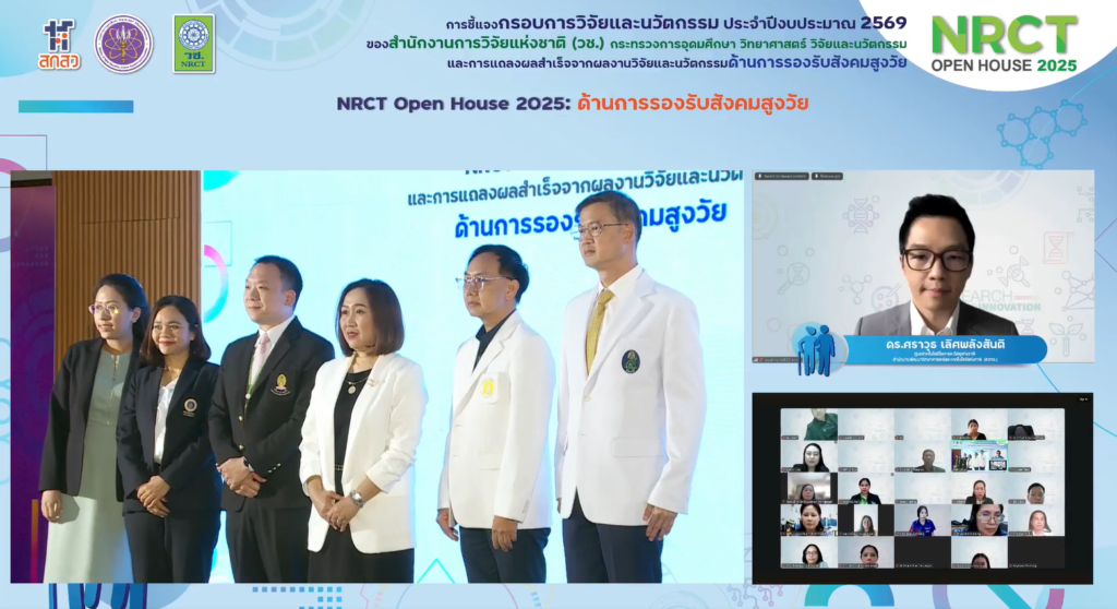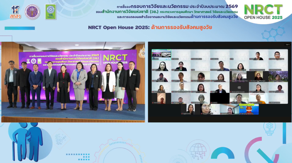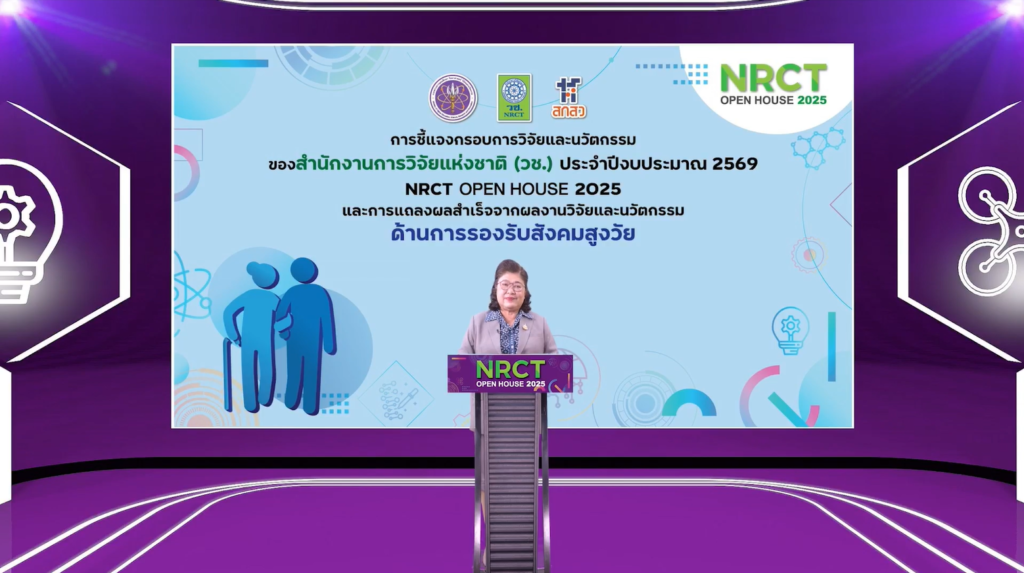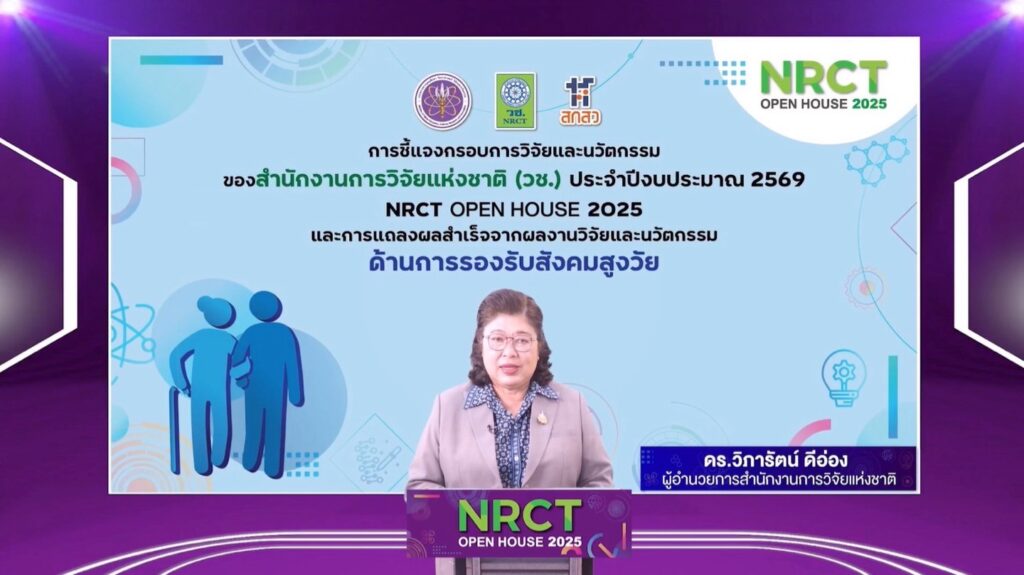 เมื่อวันที่ 26 มิถุนายน พ.ศ.2568 สำนักงานการวิจัยแห่งชาติ (วช.) กระทรวงการอุดมศึกษา วิทยาศาสตร์ วิจัยและนวัตกรรม (อว.) จัดกิจกรรมเปิดบ้านชี้แจงกรอบการวิจัยและนวัตกรรม ประจำปีงบประมาณ 2569 (NRCT Open House 2025) และการแถลงผลสำเร็จจากผลงานวิจัยและนวัตกรรม “ด้านการรองรับสังคมสูงวัย”โดยมี ดร.วิภารัตน์ ดีอ่อง ผู้อำนวยการสำนักงานการวิจัยแห่งชาติ เป็นประธานเปิดงาน โดยมีผู้เข้าร่วมรับฟังทั้งจากหน่วยงานภาครัฐ ภาคเอกชน สถาบันการศึกษา นักวิจัย ตลอดจนผู้สนใจด้านการวิจัยและนวัตกรรมเข้าร่วม ณ ห้องประชุมจอมพลสฤษดิ์ ธนะรัชต์ ชั้น 2 อาคาร วช.1