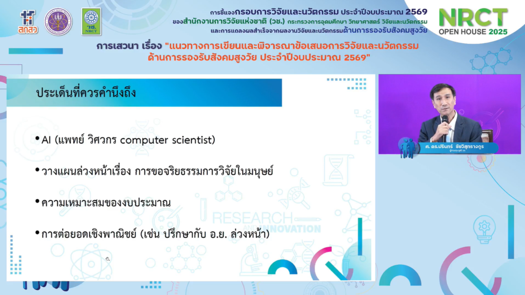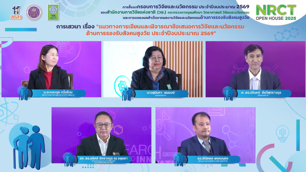 ภายในงาน ประกอบด้วยการเสวนา เรื่อง “แนวทางการเขียนและพิจารณาข้อเสนอการวิจัยและนวัตกรรม ด้านการรองรับสังคมสูงวัย ประจำปีงบประมาณ 2569” ประเด็น “สถานการณ์ด้านผู้สูงวัย และงานวิจัยที่ตอบโจทย์ความต้องการ” โดย นางสาวกอบกุล กวั่งซ้วน ผู้เชี่ยวชาญเฉพาะด้านผู้สูงอายุ กรมกิจการผู้สูงอายุ ประเด็น “ขับเคลื่อนงานวิจัยด้านสังคม สู่การพัฒนาผู้สูงวัยที่ยั่งยืน” โดย นางสุนันทา สมพงษ์ ผู้ทรงคุณวุฒิ สำนักงานการวิจัยแห่งชาติ ประเด็น “ยกระดับคุณภาพชีวิตผู้สูงวัย ด้วยเทคโนโลยีและนวัตกรรม” ศ.ดร.ปรินทร์ ชัยวิสุทธางกูร ผู้ทรงคุณวุฒิ สำนักงานการวิจัยแห่งชาติ ประเด็น “ขับเคลื่อนงานวิจัย สู่การผลักดันเชิงนโยบาย” โดย รศ.ดร.อดิศร์ อิศรางกูร ณ อยุธยา ที่ปรึกษาด้านทรัพยากรธรรมชาติและสิ่งแวดล้อม สถาบันวิจัยเพื่อการพัฒนาประเทศไทย และ ประเด็น “แนวทางความร่วมมือ สนับสนุนงานวิจัยไปสู่เชิงพาณิชย์” โดย ดร.พินิตพล พรหมบุตร ผู้อำนวยการฝ่ายปฏิบัติการ บริษัท มดกัต จำกัด โดยการเสวนาครั้งนี้ มุ่งเน้นการพัฒนาองค์ความรู้ ระบุเป้าหมายที่ชัดเจน ทั้งกลุ่มผู้ใช้ประโยชน์ กลุ่มผู้เกี่ยวข้อง รวมทั้งการให้ความสำคัญกับการเขียนข้อเสนอให้ตรงจุด