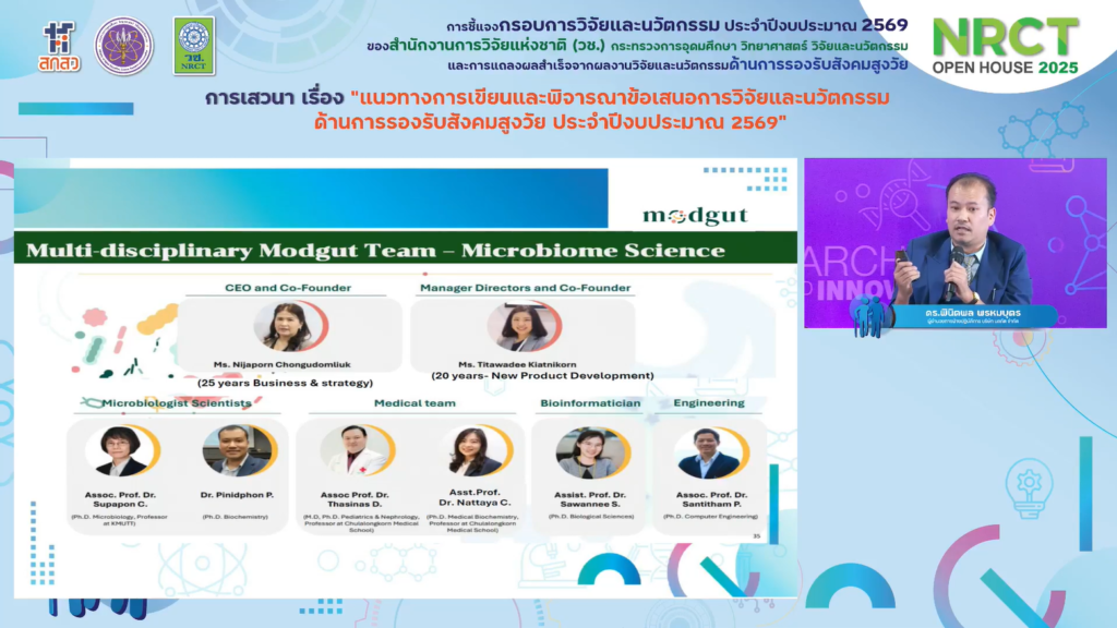 จากนั้น ได้มีการนำเสนอวีดิทัศน์ “การแนะนำการใช้งานระบบ NRIIS” โดย กองระบบและบริหารข้อมูลเชิงยุทธศาสตร์ด้านวิทยาศาสตร์ วิจัยและนวัตกรรม และวีดิทัศน์ “แนะนำมาตรฐานการวิจัยและจริยธรรมการวิจัย” โดย กองมาตรฐานการวิจัยและสถาบันพัฒนาการดำเนินการต่อสัตว์เพื่องานทางวิทยาศาสตร์ เพื่อเสริมความเข้าใจในการยื่นข้อเสนอโครงการอีกด้วย