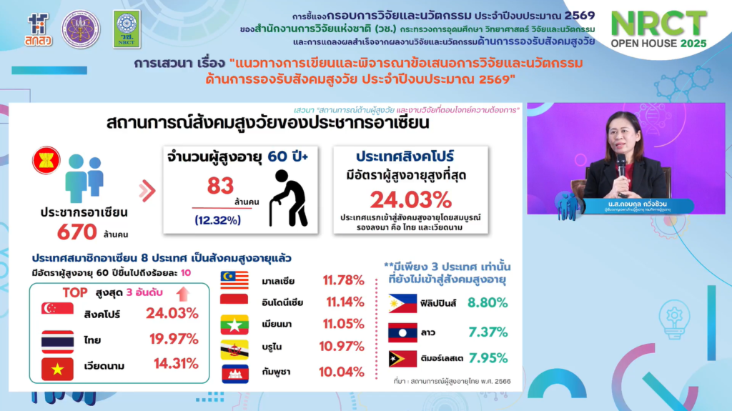 ดร.วิภารัตน์ ดีอ่อง ผู้อำนวยการสำนักงานการวิจัยแห่งชาติ (ผอ.วช.) กล่าวว่า (วช.)ได้ให้ความสำคัญกับผลสัมฤทธิ์จากงานวิจัยที่สามารถนำไปใช้ประโยชน์ โดยในมิติด้านการรองรับสังคมสูงวัย นับเป็นประเด็นสำคัญ ที่ (วช.) ให้การสนับสนุนงานวิจัยและนวัตกรรมที่สามารถตอบสนองต่อการดูแลผู้สูงอายุในทุกด้าน ทั้งด้านสุขภาพ เศรษฐกิจ สังคม และสิ่งแวดล้อม เพื่อยกระดับคุณภาพชีวิตของผู้สูงวัย และสร้างระบบรองรับที่มั่นคง ยั่งยืน และครอบคลุมในการผลักดันให้เกิดการนำผลงานวิจัยไปใช้ประโยชน์ได้อย่างเป็นรูปธรรม โดยการประสานความร่วมมือกับภาคส่วนต่างๆ ทั้งภาครัฐ เอกชน และประชาสังคม เพื่อให้ผลงานวิจัยเกิดผลลัพธ์ที่เหมาะสมต่อการใช้ประโยชน์ในหลายมิติ