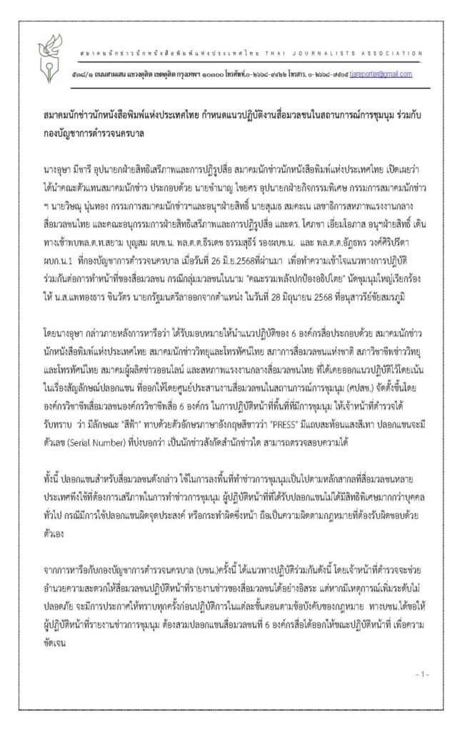 เมื่อวันที่ 27 มิถุนายน 2568 ที่สมาคมนักข่าวนักหนังสือพิมพ์แห่งประเทศไทย นางอุษา มีชารี อุปนายกฝ่ายสิทธิเสรีภาพและการปฏิรูปสื่อ สมาคมนักข่าวนักหนังสือพิมพ์แห่งประเทศไทย เปิดเผยว่า ได้นำคณะตัวแทนสมาคมนักข่าวฯ ประกอบด้วย นายชำนาญ ไชยศร อุปนายกฝ่ายกิจกรรมพิเศษ กรรมการสมาคมนักข่าวฯ,นายวิษณุ นุ่นทอง กรรมการสมาคมนักข่าวฯ และอนุฯฝ่ายสิทธิ์,นายสุเมธ สมคะเน เลขาธิการสหภาพแรงงานกลางสื่อมวลชนไทย และคณะอนุกรรมการฝ่ายสิทธิเสรีภาพและการปฏิรูปสื่อ และดร.โศภชา เอี่ยมโอภาส อนุฯฝ่ายสิทธิ์ เดินทางเข้าพบ พล.ต.ท.สยาม บุญสม ผบช.น.,พล.ต.ต.ธีรเดช ธรรมสุธีร์ รองผบช.น. และ พล.ต.ต.อัฏธพร วงศ์ศิริปรีดา ผบก.น.1 ที่กองบัญชาการตำรวจนครบาล เมื่อวันที่ 26 มิ.ย.2568 ที่ผ่านมา เพื่อทำความเข้าใจแนวทางการปฎิบัติร่วมกันต่อการทำหน้าที่ของสื่อมวลชน กรณีกลุ่มมวลชนในนาม “คณะรวมพลังปกป้องอธิปไตย” นัดชุมนุมใหญ่เรียกร้องให้ น.ส.แพทองธาร ชินวัตร นายกรัฐมนตรีลาออกจากตำแหน่ง ในวันที่ 28 มิถุนายน 2568 ที่อนุสาวรีย์ชัยสมรภูมิ