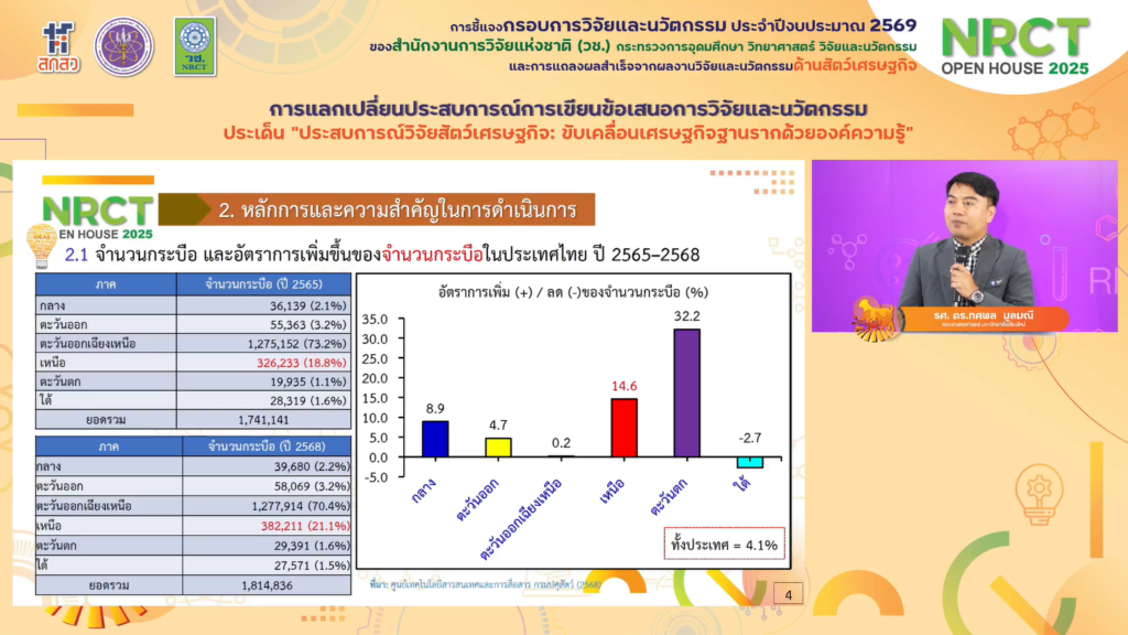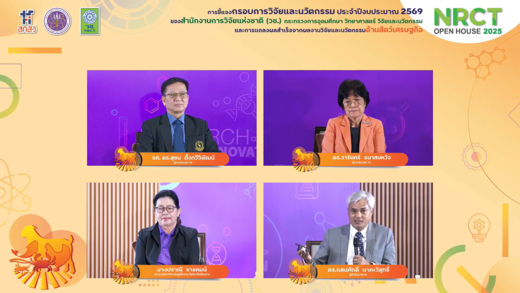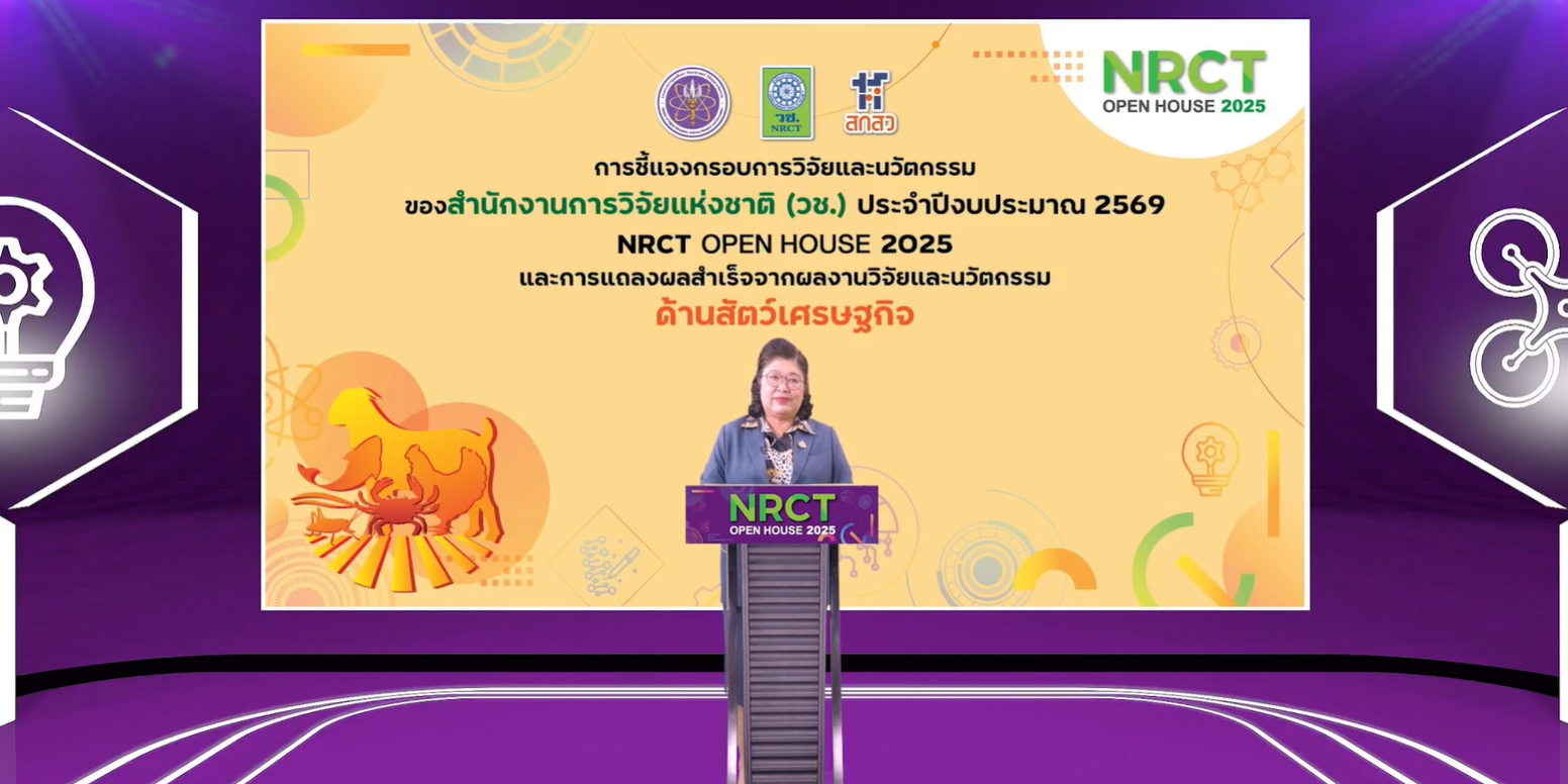 เมื่อวันที่ 26 มิถุนายน 2568 สำนักงานการวิจัยแห่งชาติ(วช.) กระทรวงการอุดมศึกษา วิทยาศาสตร์ วิจัยและนวัตกรรม (อวด.) จัดกิจกรรมเปิดบ้านชี้แจงกรอบการวิจัยและนวัตกรรม ประจำปีงบประมาณ 2569 (NRCT Open House 2025) และการแถลงผลสำเร็จจากผลงานวิจัยและนวัตกรรม “ด้านสัตว์เศรษฐกิจ” เพื่อประชาสัมพันธ์การรับข้อเสนอการวิจัยและนวัตกรรม และกรอบการวิจัยและนวัตกรรม ประจำปีงบประมาณ 2569 โดย ดร.วิภารัตน์ ดีอ่อง ผู้อำนวยการสำนักงานการวิจัยแห่งชาติ เป็นประธานเปิดงาน ณ ห้องประชุม