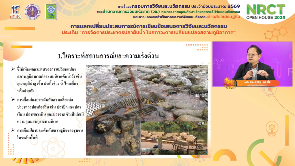 -ประเด็น “การจัดการประชากรปลาต้นน้ำ ในสภาวะการเปลี่ยนแปลงสภาพภูมิอากาศ” โดย ผู้ช่วยศาสตราจารย์ ดร.เอกชัย ดวงใจ (มหาวิทยาลัยเทคโนโลยีราชมงคลล้านนา น่าน)