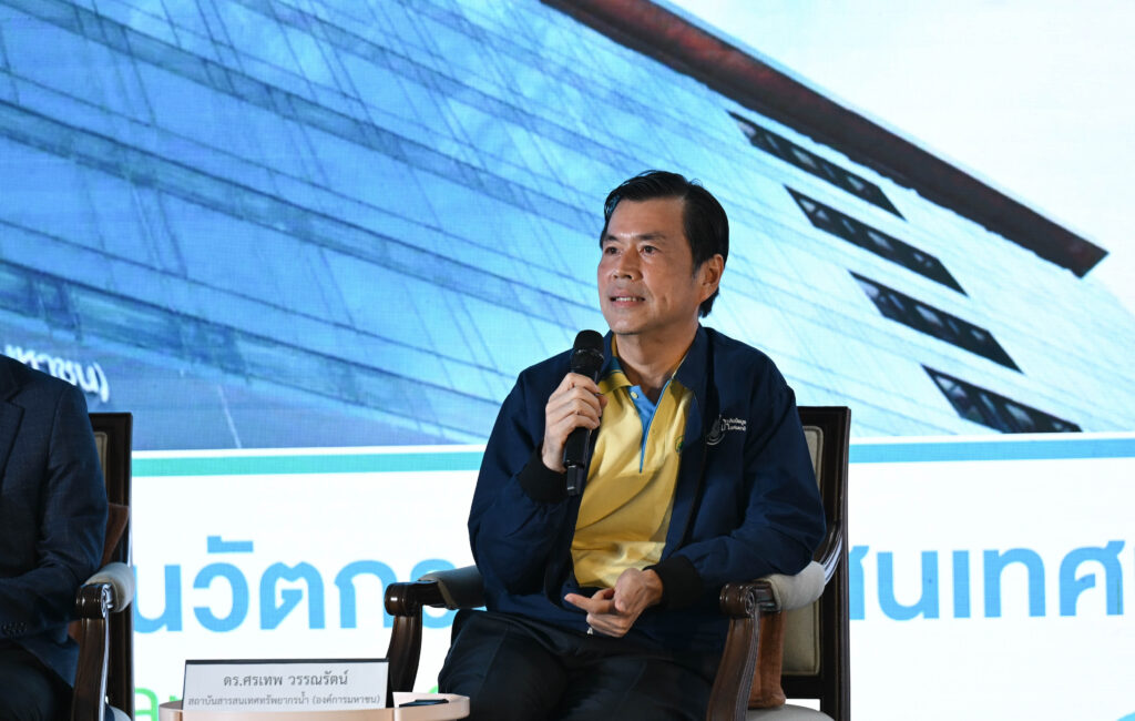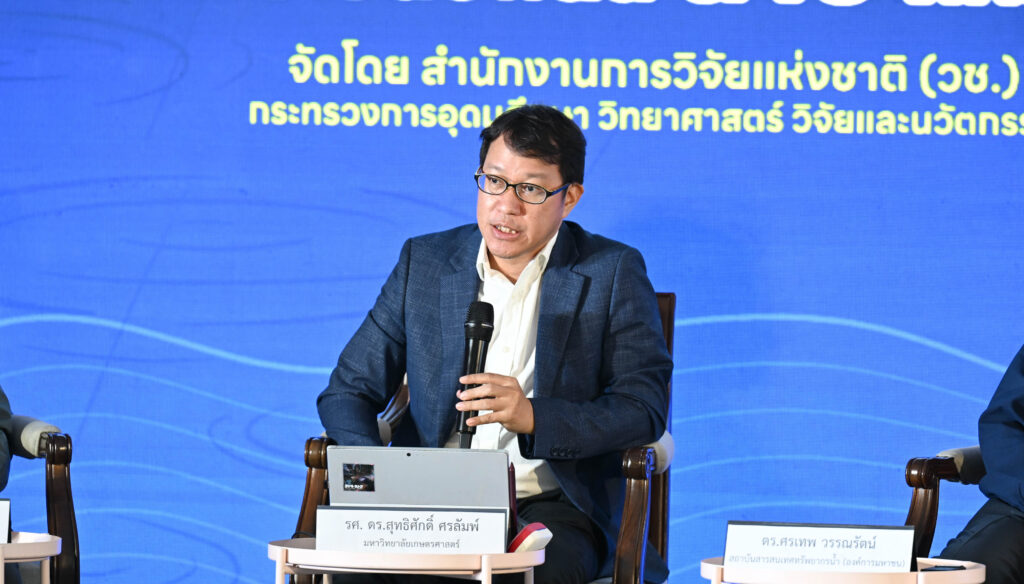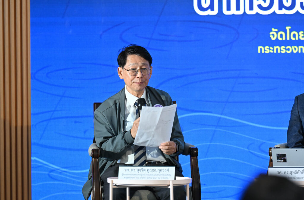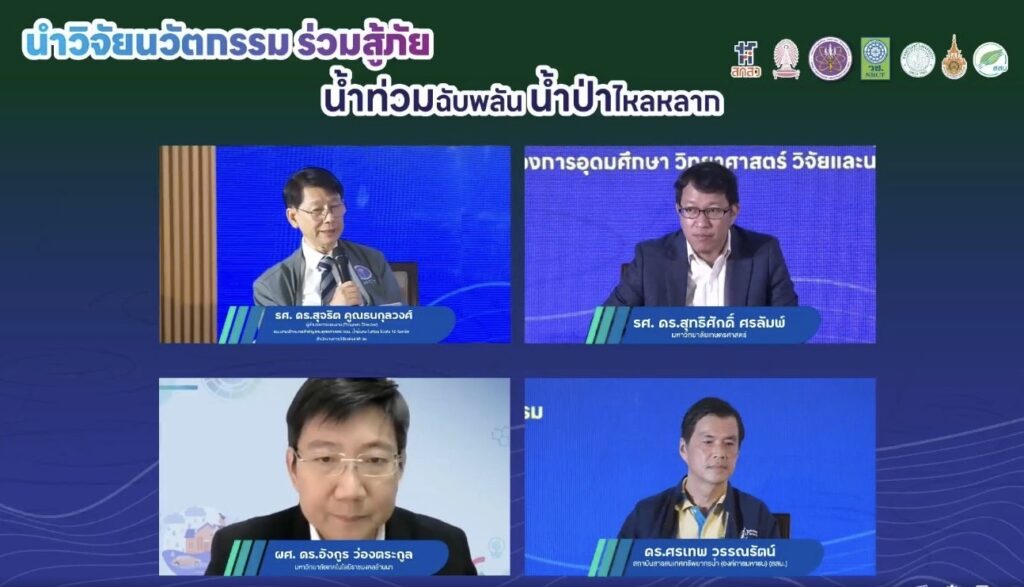 ในช่วงเสวนา เรื่อง “นำวิจัยนวัตกรรม ร่วมสู้ภัย น้ำท่วมฉับพลัน น้ำป่าไหลหลาก” ซึ่งวิทยากรผู้เชี่ยวชาญได้ให้ข้อมูลการ วิจัย และนวัตกรรมที่นำไปใช้ในเป็นแนวทางการแก้ไข ฟื้นฟู และป้องกันผลกระทบจากเหตุการณ์อุทกภัย ซึ่งเป็นส่วนหนึ่งของแผนงานเป้าหมายตามยุทธศาสตร์ (ววน.) ในประเด็น “น้ำมั่นคง ไม่ท่วม ไม่แล้ง” รศ.ดร.สุจริต คูณธนกุลวงศ์ ผู้อำนวยการแผนงาน (Program Director) แผนงานเป้าหมายสำคัญตามยุทธศาสตร์ (ววน.) น้ำมั่นคง ไม่ท่วม ไม่แล้ง ใน 10 จังหวัด ของ (วช.) เป็นผู้ดำเนินการเสวนา ผู้ร่วมเสวนาประกอบด้วย