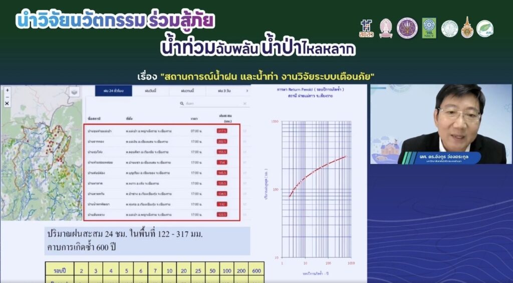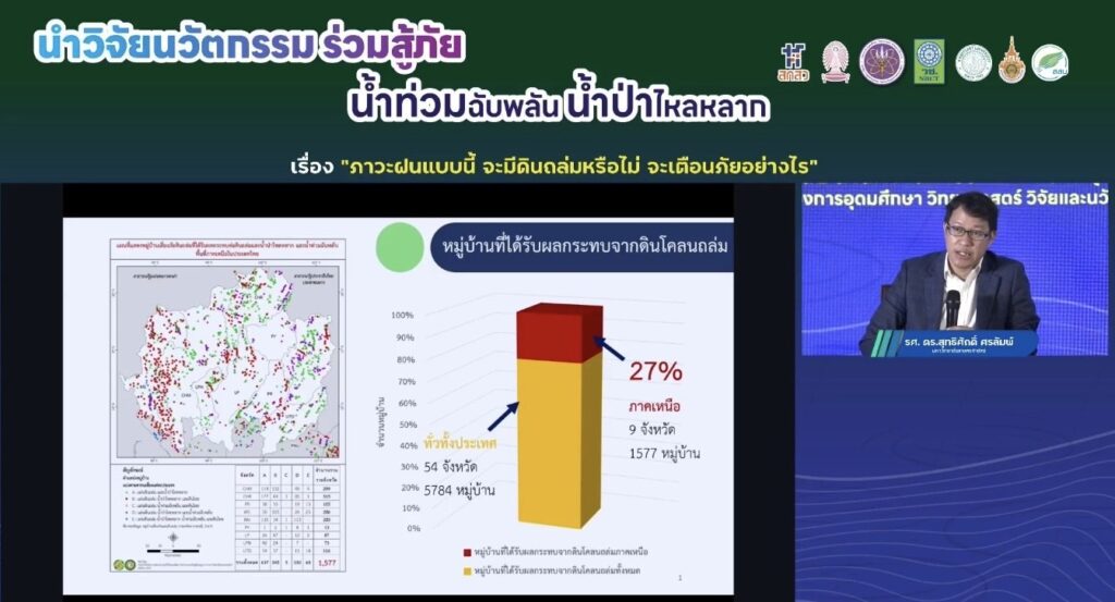 รศ.ดร.สุทธิศักดิ์ ศรลัมพ์ มหาวิทยาลัยเกษตรศาสตร์ ให้ข้อมูลเกี่ยวกับ ภาวะฝนที่เชื่อมโยงกับเหตุดินถล่ม รวมถึงการเตือนภัย ให้ข้อมูลว่าในพื้นที่อำเภอพญาเม็งรายไม่ใช่พื้นที่ชันและสูง ทำให้ความเสี่ยงน้อยกว่าฝั่งอำเเภอแม่อาย โดยในการเตือนภัยปัจจุบันเราใช้ข้อมูลฝนล่วงหน้า 2 วัน จาก (สสน.) มาทำนายโดยใช้แบบจำลอง โดยความเสี่ยง ณ ปัจจุบัน คือ พื้นที่จังหวัดน่าน อำเภอฝาง จังหวัดเชียงใหม่ จังหวัดเชียงรายในบางพื้นที่ และจังหวัดตาก โดยข้อมูลเหล่านี้ กรมทรัพยากรธรณีใช้เป็นข้อมูลควบคู่กับการประเมินสถานการณ์ในพื้นที่จริง เนื่องจากการจัดการดินถล่มเป็นเรื่องเฉพาะจุด ซึ่งในการวิจัยเป็นการลงพื้นที่เพื่อประเมินความเสี่ยง และให้ข้อมูลแก่ชาวบ้านที่อยู่ในพื้นที่ เพื่อการปรับตัว เช่น ย้ายออก หรือปรับปรุงโครงสร้างให้เหมาะสมในกรณีที่ยังไม่สามารถย้ายออกร่วมกับหน่วยงานพันธมิตร รวมถึงการเตือนภัยผ่านแอพพลิเคชั่น ซึ่งจะมีการวิจัยต่อยอดเพื่อให้มีความแม่นยำเพิ่มขึ้น