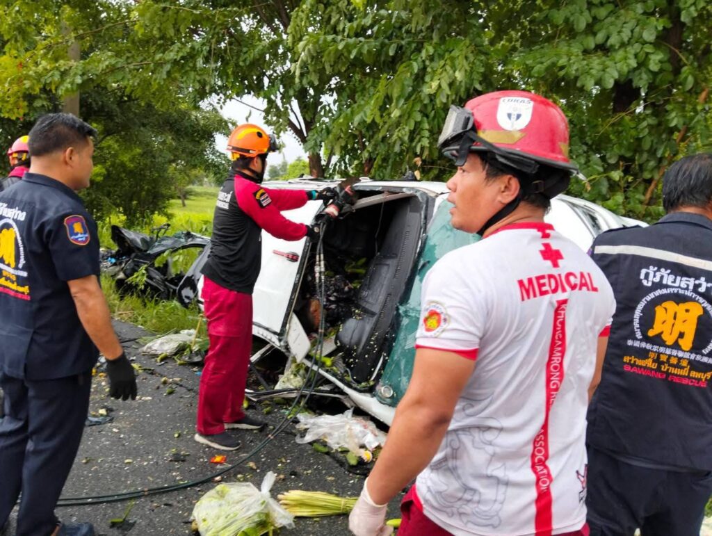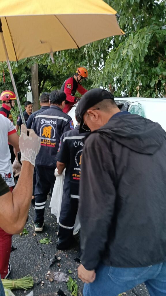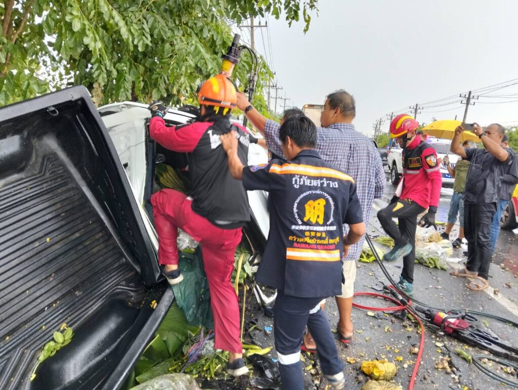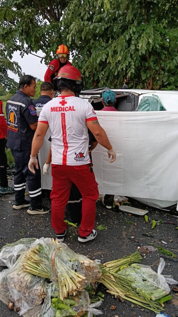 ผู้โดยสารกระเด็นออกจากรถเก๋งบาดเจ็บอีก 3คน แต่คนขับรถกระบะขนผักดับคาที่