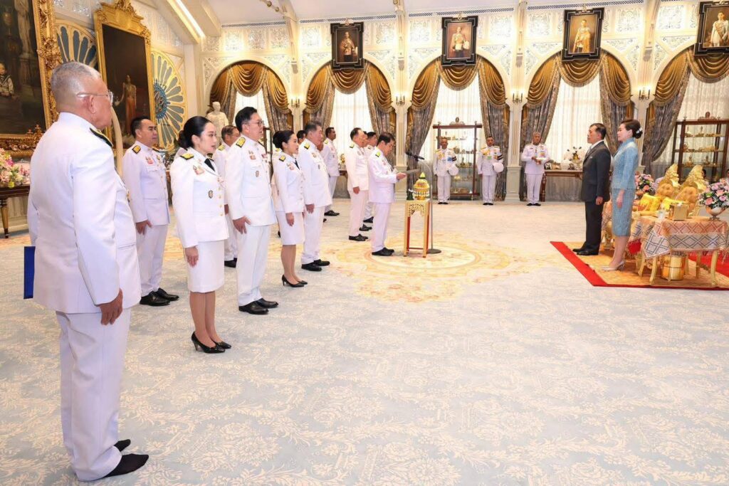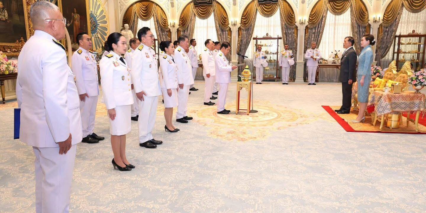 วันนี้ (3 ก.ค.) พระบาทสมเด็จพระเจ้าอยู่หัว และสมเด็จพระนางเจ้า ฯ พระบรมราชินี เสด็จออก ณ พระที่นั่งอัมพรสถาน พระราชวังดุสิต พระราชทานพระบรมราชวโรกาสให้ นายสุริยะ จึงรุ่งเรืองกิจ รองนายกรัฐมนตรี รักษาราชการแทนนายกรัฐมนตรี นำคณะรัฐมนตรีซึ่งทรงพระกรุณาโปรดเกล้าโปรดกระหม่อมแต่งตั้งใหม่จำนวน 14 คน เฝ้าทูลละอองธุลีพระบาท ถวายสัตย์ปฎิญาณก่อนรับหน้าที่