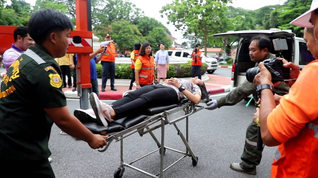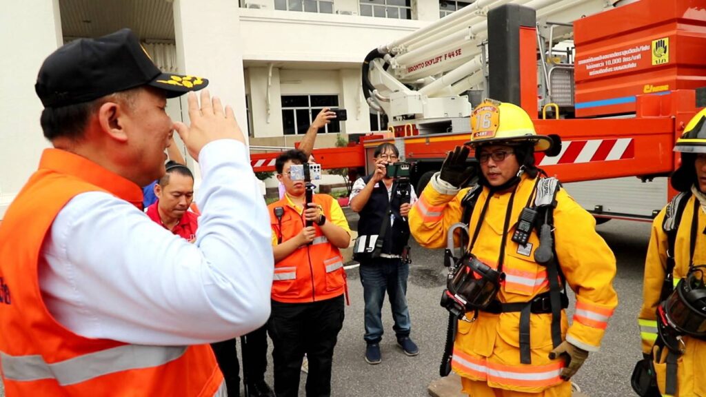 หลังอบรมให้ความรู้เสร็จได้จัดให้มีการฝึกซ้อมดับเพลิงและอพยพขึ้น โดยมีนายวราดิศร อ่อนนุช รองผู้ว่าราชการจังหวัดสิงห์บุรี เป็นผู้บัญชาการเหตุการณ์ โดยสมมุติเหตุเพลิงใหม่บริเวณชั้น 3 ของศาลากลางจังหวัดตึก 5 ชั้น ต้นเหตุเกิดจากไฟฟ้าลัดวงจรที่ห้องสำนักงานป้องกันและบรรเทาสาธารณภัยในช่วงเวลาทำงานของส่วนราชการจำนวนกว่า 22 หน่วยงาน มีข้าราชการทำงานอยู่จำนวนกว่า 200 คน และหลังอพยพพบว่ามีผู้สูญหายที่ไม่ได้อพยพออกจากสำนักงานจำนวน 2 ราย เป็นเจ้าหน้าที่ของหน่วยงานที่ตั้งอยู่ชั้น 3 ในอาคารที่เกิดเหตุ เจ้าหน้าที่ดับเพลิงจึงใช้รถกระเช้าส่งเจ้าหน้าที่ขึ้นไปทำการค้นหาและช่วยเหลือ