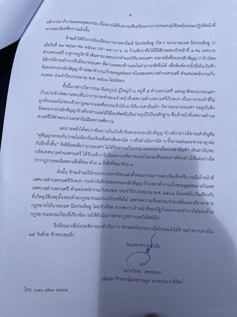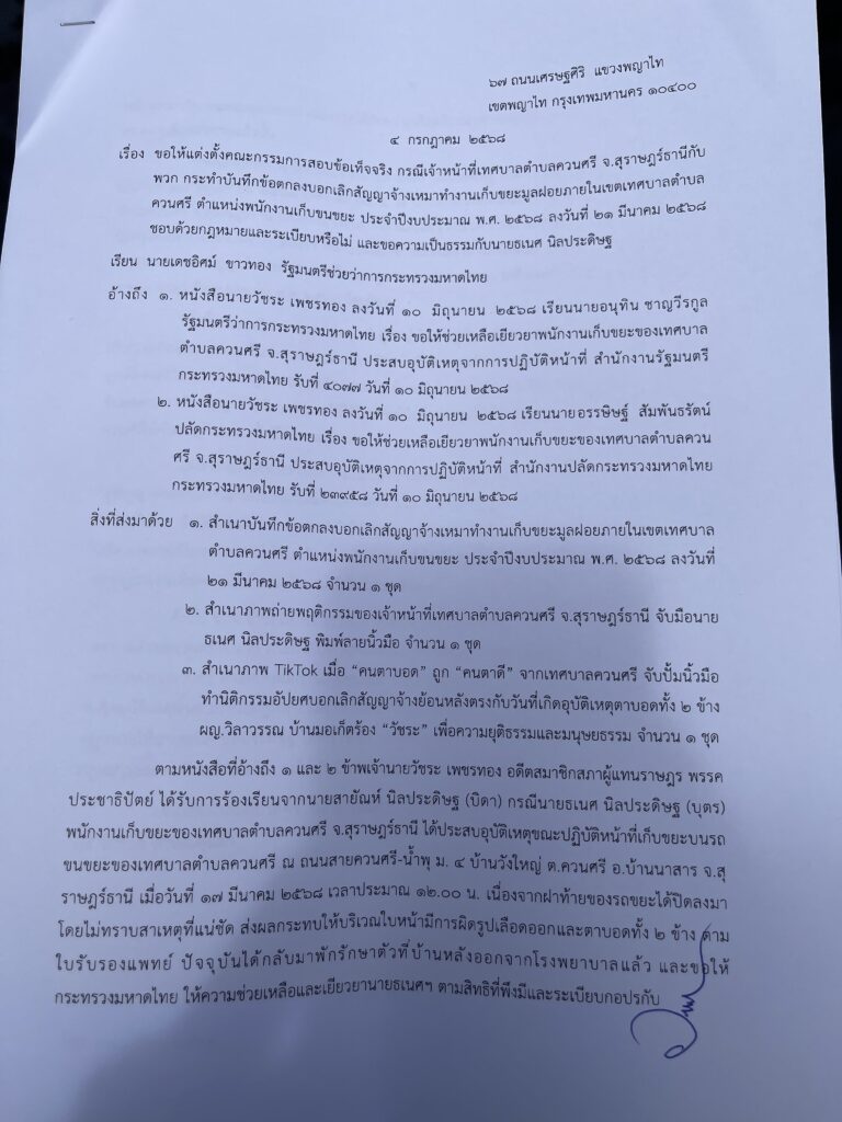 จากคำร้องเรียนของ นายสายัณห์ นิลประดิษฐ บิดาของผู้เสียหาย ระบุว่า เมื่อวันที่ 29 พฤษภาคม 2568 เวลาประมาณ 14.00 น. ได้มีเจ้าหน้าที่เทศบาล 3 คน รวมถึงนิติกรของเทศบาล เดินทางมาที่บ้านพักของนายธเนศ พร้อมนำเอกสาร “บันทึกข้อตกลงบอกเลิกสัญญาจ้างเหมางานเก็บขยะ” ซึ่งระบุวันที่ย้อนหลังเป็น 21 มีนาคม 2568 — วันเดียวกับเหตุการณ์ประสบอุบัติเหตุ