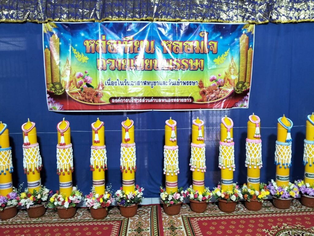 พันตำรวจเอก(พิเศษ)ธนศักดิ์ ปานแย้ม นายกองค์การบริหารส่วนตำบลหนองทรายขาว พร้อมด้วยคณะผู้บริหาร, สมาชิกสภา, หัวหน้าส่วนราชการ, ข้าราชการ, พนักงาน, ลูกจ้างองค์การบริหารส่วนตำบลหนองทรายขาว และนางสาวชญาดา จันทร์กลิ่น กำนันตำบลหนองทรายขาว พร้อมด้วยชมรมกำนันผู้ใหญ่บ้านตำบลหนองทรายขาว, และผู้อำนวยการ, คณะครู, นักเรียนโรงเรียนบ้านสระเตย ร่วมสืบสานประเพณี “หล่อเทียน หลอมใจ ถวายเทียนเข้าพรรษา” เนื่องในวันอาสาฬหบูชา และเข้าพรรษา ประจำปี 2568 จัดขึ้น ณ วัดเนินยาว หมู่ที่ 6 บ้านเนินยาว และพี่น้องชาวตำบลหนองทรายขาว เข้าร่วมสืบสานประเพณีอันดีงามและวัฒนธรรมการหล่อเทียนเข้าพรรษา
