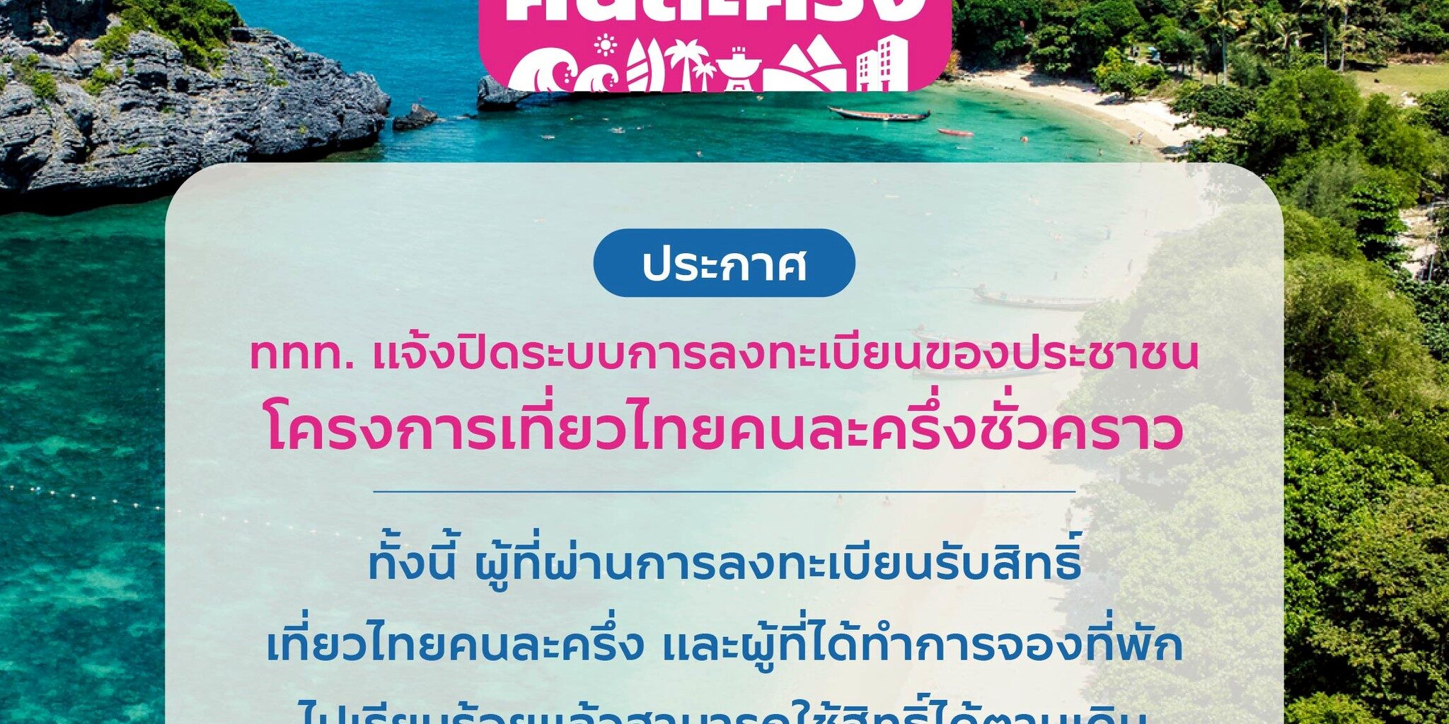 การท่องเที่ยวแห่งประเทศไทย (ททท.) ขอแจ้งปิดการลงทะเบียนสำหรับประชาชนที่ต้องการเข้าร่วมใช้สิทธิ์โครงการ “เที่ยวไทยคนละครึ่ง” ชั่วคราว ตั้งแต่วันที่ 4 กรกฎาคม 2568 เป็นต้นไป เพื่อปรับปรุงพัฒนาระบบที่เกี่ยวข้องให้สามารถรองรับการใช้งานของนักท่องเที่ยวและผู้ประกอบการท่องเที่ยวได้อย่างเต็มประสิทธิภาพ และป้องกันความผิดพลาดที่อาจส่งผลกระทบต่อประชาชนและผู้ประกอบการท่องเที่ยว โดยประชาชนที่ลงทะเบียนสำเร็จและใช้สิทธิ์จองที่พักเรียบร้อยแล้ว สามารถเดินทางใช้สิทธิ์ได้ตามกำหนดเวลาที่ได้ใช้สิทธิ์ไว้