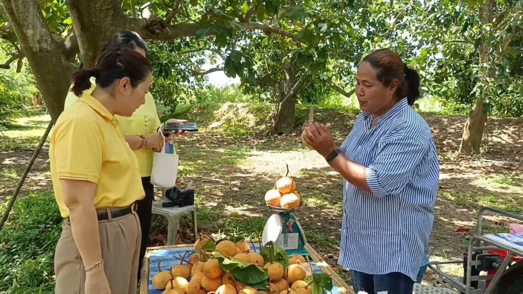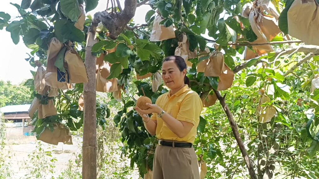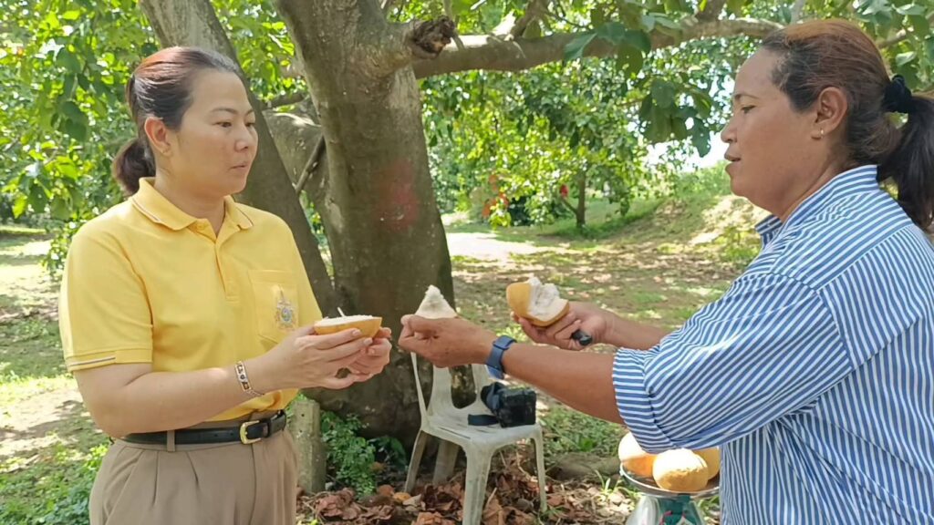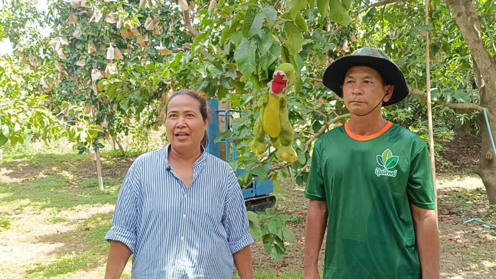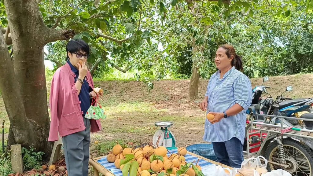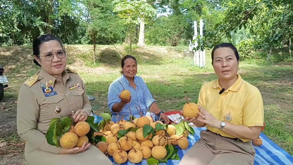 นางสงกรานต์ บุตรจินดา (เจ๊กาหลง) และสามี เจ้าของสวนกระท้อนพันธุ์ทับทิม บ้านเลขที่ 45 หมู่1 ตำบลพิกุลทอง อำเภอท่าช้าง จังหวัดสิงห์บุรี ใช้พื้นที่สวน 3 ไร่ ปลูกกระท้อนพันธุ์ทับทิมจำนวน 25 ต้นมานานกว่า 30 ปี ปลูก 3 ปีแลกก็ให้ผลผลิตแล้วตอนนี้กำลังได้ความนิยมสูงเพราะมีรสชาติหวานฉ่ำ เนื้อเยอะ มีเปลือกบาง ผิวขรุขระ สีเหลืองเข้ม ลูกไม่ใหญ่มาก เดือนพฤษภาคมถึงเดือนมิถุนายน ออกดอกติดผลง่ายลูกดก ต้น 1 ให้ผลผลิตประมาณ 100 ลูก ราคาตามไซส์เริ่มต้นที่ 20 จนถึง 80 บาท มีสามีช่วยดูแลสวนและเก็บผลผลิตด้วยรถโฟล์คลิฟท์ใช้ขึ้นลงสะดวกรวดเร็วไม่ต้องจ้างแรงงานเพิ่มช่วยกันสองคนสามีและภรรยาคอยชั่งกิโลขายพร้อมปลอกให้ลูกค้าได้ลองชิมกัน มีลูกค้าขาประจำมาจับจองซื้อกันเป็นประจำทุกปีจนผลผลิตสวนเจ๊หลงไม่พอขาย ทำให้สวนของญาติและเพื่อนบ้าน รวมพื้นที่ปลูกในอำเภอท่าช้าง กว่า 50 ไร่ ขายดีไปด้วย โดยนางสาวดวงพร วิสุทธิธรรม พาณิชย์จังหวัดสิงห์บุรี ร่วมกับ นางสาวโสภา กองเนตร นายอำเภอท่าช้าง และเจ้าหน้าที่ ลงพื้นที่ไปส่งเสริมและอุดหนุน สวนกระท้อนเจ๊กาหลง สวนกระท้อน “สายพันธุ์ทับทิม” ผลไม้พันธุ์พื้นเมืองเพื่อผลักดันการขึ้นทะเบียนเป็นสิ่งบ่งชี้ทางภูมิศาสตร์ (GI) ของจังหวัดสิงห์บุรี ที่มีเฉพาะในท้องถิ่นสืบทอดมาหลายชั่วอายุคน เป็นแหล่งท่องเที่ยวเชิงเกษตรเป็นผลไม้พื้นเมืองท้องถิ่น สามารถสร้างรายได้ให้ชุมชนได้อย่างยั่งยืนทุกปี