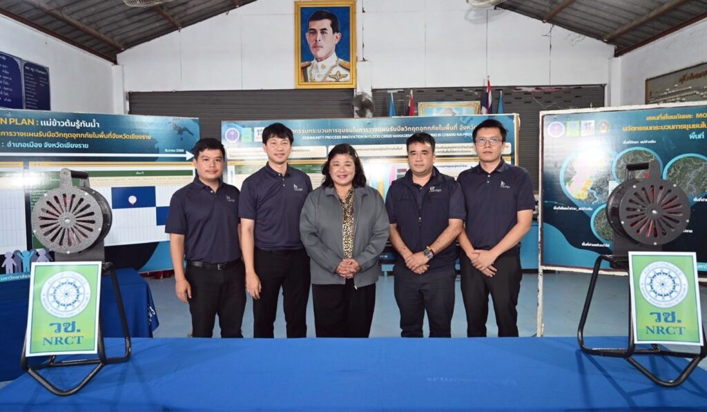 วันที่ 15 กรกฎาคม 2568 สำนักงานการวิจัยแห่งชาติ (วช.) กระทรวงการอุดมศึกษา วิทยาศาสตร์ วิจัยและนวัตกรรม (อว.) โดย ดร.วิภารัตน์ ดีอ่อง ผู้อำนวยการสำนักงานการวิจัยแห่งชาติ (ผอ.วช.) พร้อมด้วยคณะผู้ทรงคุณวุฒิจาก (วช.) นำคณะผู้บริหารและเจ้าหน้าที่ลงพื้นที่ตำบลแม่ข้าวต้ม อำเภอเมือง จังหวัดเชียงราย เพื่อติดตามผลสำเร็จ “โครงการนวัตกรรมกระบวนการชุมชนในการวางแผนรับมือวิกฤตอุทกภัยในพื้นที่จังหวัดเชียงราย” โดย ผศ.ดร.จักรกฤษณ์ คณารีย์ จาก มหาวิทยาลัยราชภัฏเชียงราย เป็นหัวหน้าโครงการ พร้อมด้วยคณะนักวิจัยในพื้นที่ โดยมี นายบุรพล มุ้งทอง ปลัดอำเภอเมืองเชียงราย นายเพียร กันติ๊บ นายกองค์การบริหารส่วนตำบลแม่ข้าวต้ม ผู้นำชุมชน และประชาชนในพื้นที่ตำบลแม่ข้าวต้ม เข้าร่วมให้การต้อนรับและร่วมแลกเปลี่ยนข้อมูลเชิงพื้นที่ซึ่งการลงพื้นที่ในครั้งนี้มีเป้าหมายในการผลักดันองค์ความรู้จากงานวิจัยสู่การใช้ประโยชน์จริงในระดับพื้นที่ ผ่านความร่วมมือระหว่างนักวิจัยและชุมชน