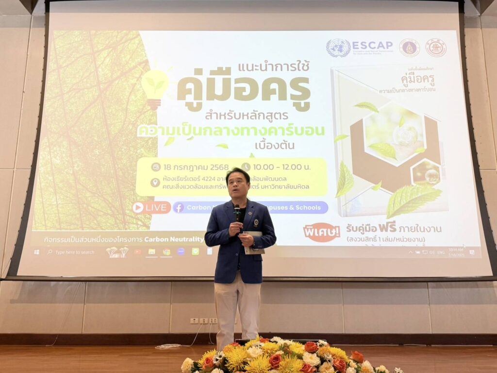 มหาวิทยาลัยมหิดลในฐานะผู้ร่วมก่อตั้ง “เครือข่ายมหาวิทยาลัยยั่งยืนแห่งประเทศไทย” ได้ขับเคลื่อนแนวคิดความเป็นกลางทางคาร์บอนอย่างต่อเนื่องผ่านโครงการ Carbon Neutrality Campus (CNC) ซึ่งริเริ่มโดยคณะสิ่งแวดล้อมฯ ด้วยทุนสนับสนุนความร่วมมือระหว่างประเทศ (Joint Unit) มหาวิทยาลัยมหิดล และได้รับความร่วมมือจากองค์กรระดับนานาชาติ ได้แก่ ได้แก่ UNESCAP และ Shanghai Jiao Tong University โดยปัจจุบันมีเครือข่ายร่วมมือจากกว่า 10 ประเทศในภูมิภาคเอเชีย ล่าสุด โครงการ CNC ได้ขยายผลลงสู่ระดับโรงเรียน ด้วยความเชื่อมั่นว่าเยาวชนคือพลังสำคัญในการขับเคลื่อนสังคมในระยะยาว และการเรียนรู้เกี่ยวกับการเปลี่ยนแปลงสภาพภูมิอากาศและความเป็นกลางทางคาร์บอน ควรเริ่มตั้งแต่วัยเรียน โดย “คู่มือครูความเป็นกลางทางคาร์บอน” ถือเป็นเครื่องมือสำคัญในการส่งเสริมกระบวนการเรียนการสอนด้านนี้อย่างเป็นระบบและเข้าใจง่าย คู่มือฯ ฉบับนี้ประกอบด้วยเนื้อหาครอบคลุม 8 บทเรียนสำคัญ ได้แก่ ความยั่งยืนและเป้าหมายการพัฒนาที่ยั่งยืน (SDGs),การเปลี่ยนแปลงสภาพภูมิอากาศ,ก๊าซเรือนกระจก,แนวคิดวัฏจักรชีวิต,คาร์บอนฟุตพริ้นท์,การดูดกลับก๊าซเรือนกระจก,การลดการปล่อยก๊าซเรือนกระจก และความเป็นกลางทางคาร์บอนและการปล่อยก๊าซเรือนกระจกสุทธิเป็นศูนย์ โดยภายในคู่มือมีรายละเอียดที่ช่วยให้ครูสามารถนำไปใช้ได้จริง เช่น จุดประสงค์ของบทเรียน สาระสำคัญ แนวทางการจัดการเรียนรู้ ตัวอย่างกิจกรรม แบบทดสอบ และแนวทางการวัดและประเมินผล พร้อมแหล่งอ้างอิงและช่องทางสำหรับการเข้าถึงข้อมูลเพิ่มเติม
