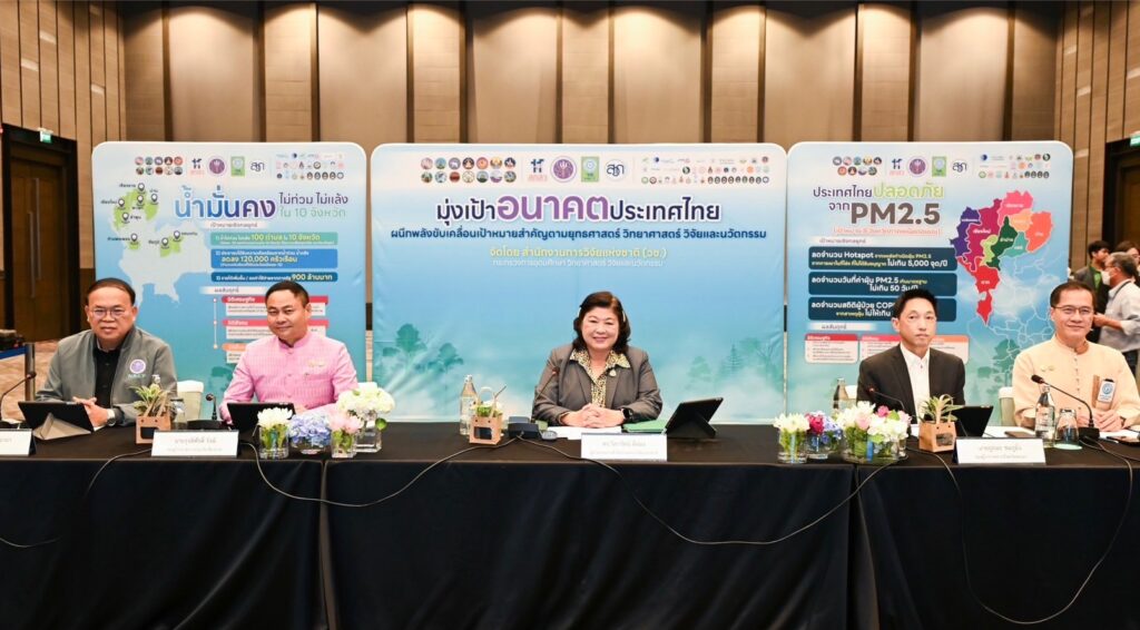 2) “น้ำมั่นคง ไม่ท่วม ไม่แล้ง” ครอบคลุม 10 จังหวัด โดยในครั้งนี้ วช.ได้ขยายความร่วมมือไปยังจังหวัดเชียงรายและพะเยา โดยมีการลงนาม MOU กับหน่วยงานภาคี เพื่อเสริมกลไกการขับเคลื่อนงานวิจัยและนวัตกรรมสู่พื้นที่จริง ผ่านกิจกรรมเสวนา การจัดแสดงนิทรรศการ และการแลกเปลี่ยนแนวทางแก้ไขปัญหาฝุ่น PM2.5 และภัยจากน้ำท่วม-น้ำแล้ง