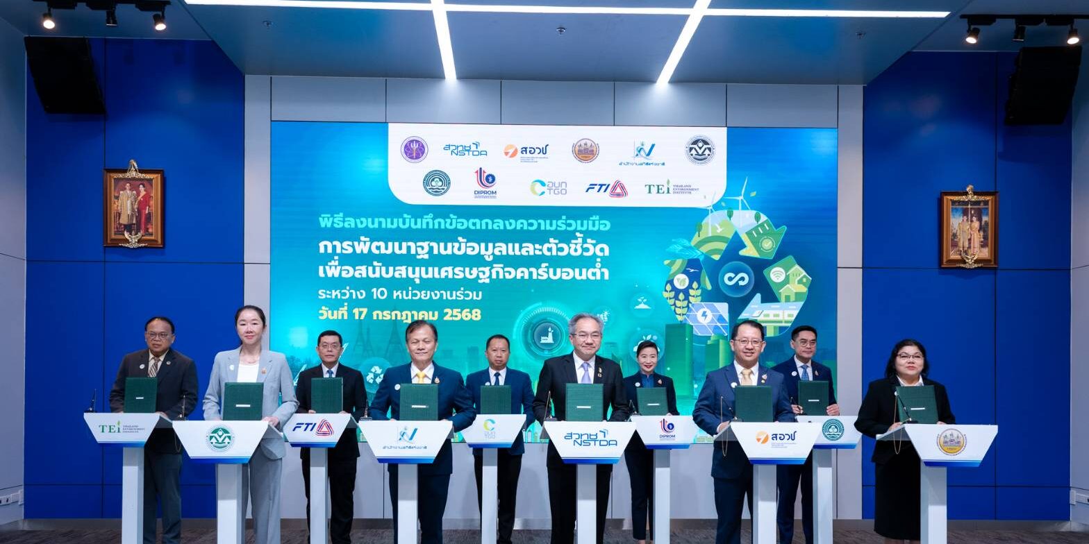 เมื่อวันที่ 17 กรกฎาคม 2568 ที่ห้องแถลงข่าว ชั้น 1 อาคารพระจอมเกล้า กระทรวงการอุดมศึกษา วิทยาศาสตร์ วิจัยและนวัตกรรม ถนนพระราม 6 กรุงเทพฯ : ศาสตราจารย์ ดร.ชูกิจ ลิมปิจำนงค์ ผู้อำนวยการสำนักงานพัฒนาวิทยาศาสตร์และเทคโนโลยีแห่งชาติ (สวทช.) พร้อมด้วย รองศาสตราจารย์ ดร.เติมศักดิ์ ศรีคิรินทร์ ผู้อำนวยการศูนย์เทคโนโลยีโลหะและวัสดุแห่งชาติ สังกัดกระทรวงการอุดมศึกษา วิทยาศาสตร์ วิจัยและนวัตกรรม (อว.) ลงนามบันทึกข้อตกลง “ความร่วมมือการพัฒนาฐานข้อมูลและตัวชี้วัดเพื่อสนับสนุนเศรษฐกิจคาร์บอนต่ำ” ร่วมกับผู้บริหารจาก 9 หน่วยงาน ประกอบด้วย รองศาสตราจารย์ วงกต วงศ์อภัย รองผู้อำนวยการสำนักงานสภานโยบายการอุดมศึกษา วิทยาศาสตร์ วิจัยและนวัตกรรมแห่งชาติ (สอวช.),นายดนุชา พิชยนันท์ เลขาธิการสภาพัฒนาการเศรษฐกิจและสังคมแห่งชาติ (สศช.),นายภุชพงค์ โนดไธสง ผู้อำนวยการสำนักงานสถิติแห่งชาติ (สสช.),ดร.ชญานันท์ ภักดีจิตต์ เลขาธิการสำนักงานนโยบายและแผนทรัพยากรธรรมชาติและสิ่งแวดล้อม (สผ.),ดร.พิรุณ สัยยะสิทธิ์พานิช อธิบดีกรมการเปลี่ยนแปลงสภาพภูมิอากาศและสิ่งแวดล้อม (สส.),นางสาวณัฏฐิญา เนตยสุภา อธิบดีกรมส่งเสริมอุตสาหกรรม (กสอ.),นายณกรณ์ ตรรกวิรพัท ผู้อำนวยการองค์การบริหารจัดการก๊าซเรือนกระจก (องค์การมหาชน) (อบก.),นายกิตติพงศ์ ลิ่มสุวรรณโรจน์ กรรมการบริหารสถาบันการเปลี่ยนแปลงสภาพภูมิอากาศ สภาอุตสาหกรรมแห่งประเทศไทย (ส.อ.ท.) และ ดร.วิจารย์ สิมาฉายา ผู้อำนวยการมูลนิธิสถาบันสิ่งแวดล้อมไทย (มสท.)