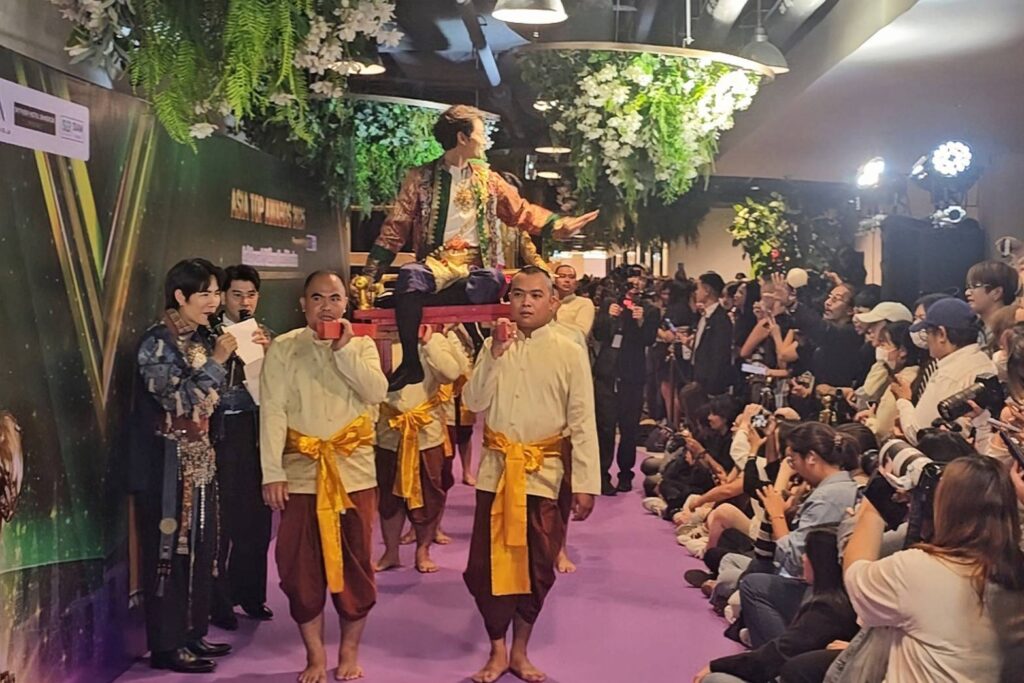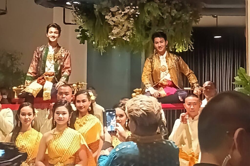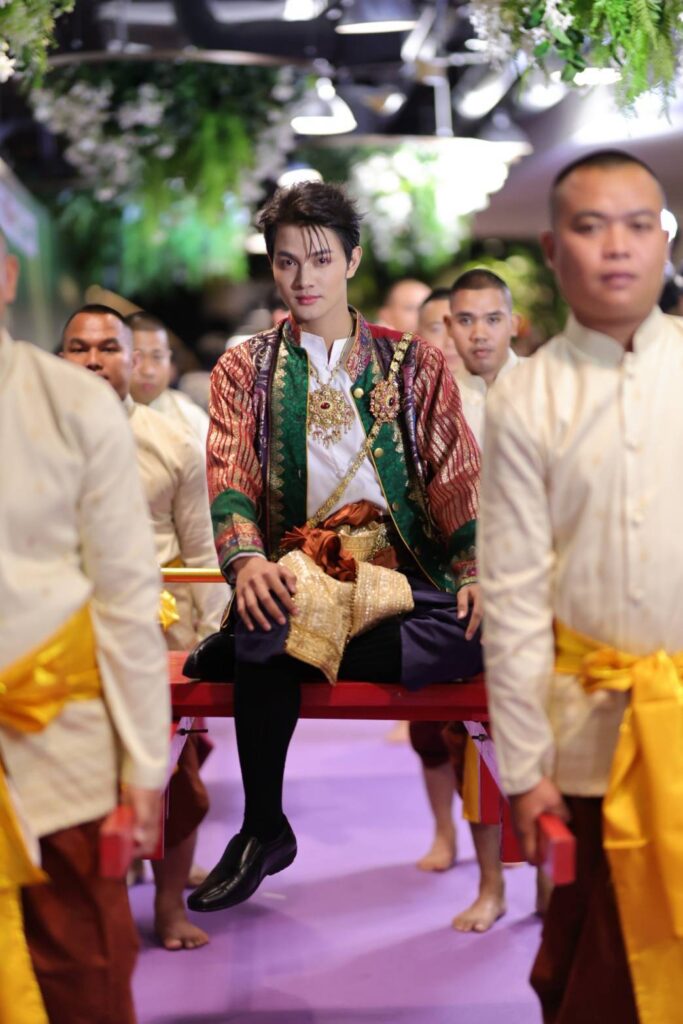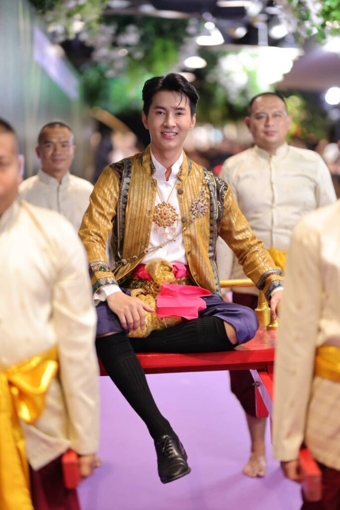 การปรากฏตัวของทั้งคู่เรียกเสียงฮือฮาจากแฟนคลับ แขกภายในงาน ด้วยขบวนเสลี่ยง พร้อมนางรำ และเครื่องแต่งกายชุดไทยพีเรียดสุดวิจิตร ที่สื่อถึงความงดงามและอัตลักษณ์ของวัฒนธรรมไทยได้อย่างน่าประทับใจ โดยเฉพาะ ชุดไทยและเครื่องประดับที่ออกแบบและตัดเย็บขึ้นเป็นพิเศษโดย จากห้องเสื้อ “ปัตบ้านผม” ซึ่งถ่ายทอดความวิจิตรบรรจงและเอกลักษณ์ไทยได้อย่างโดดเด่น
