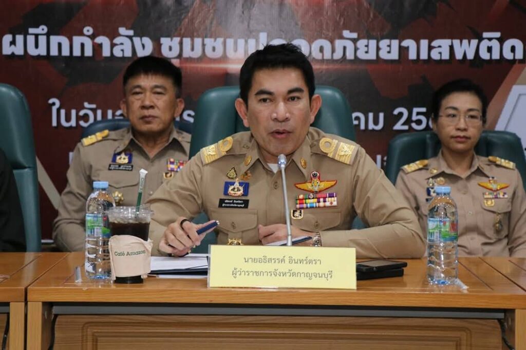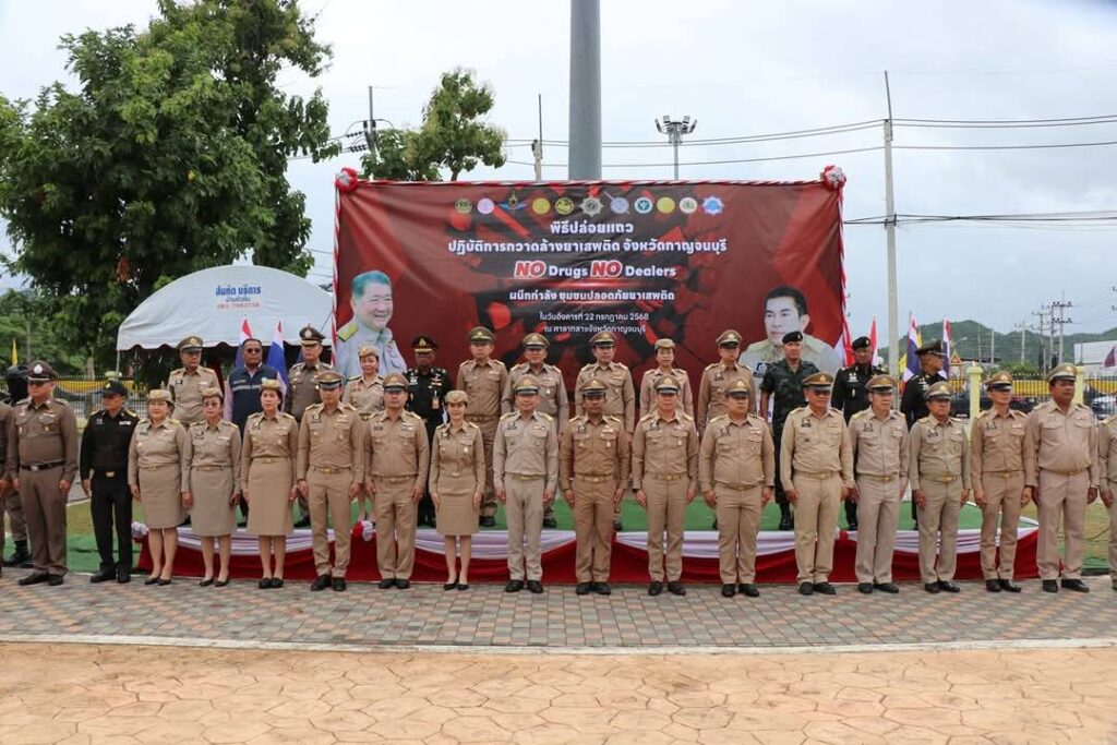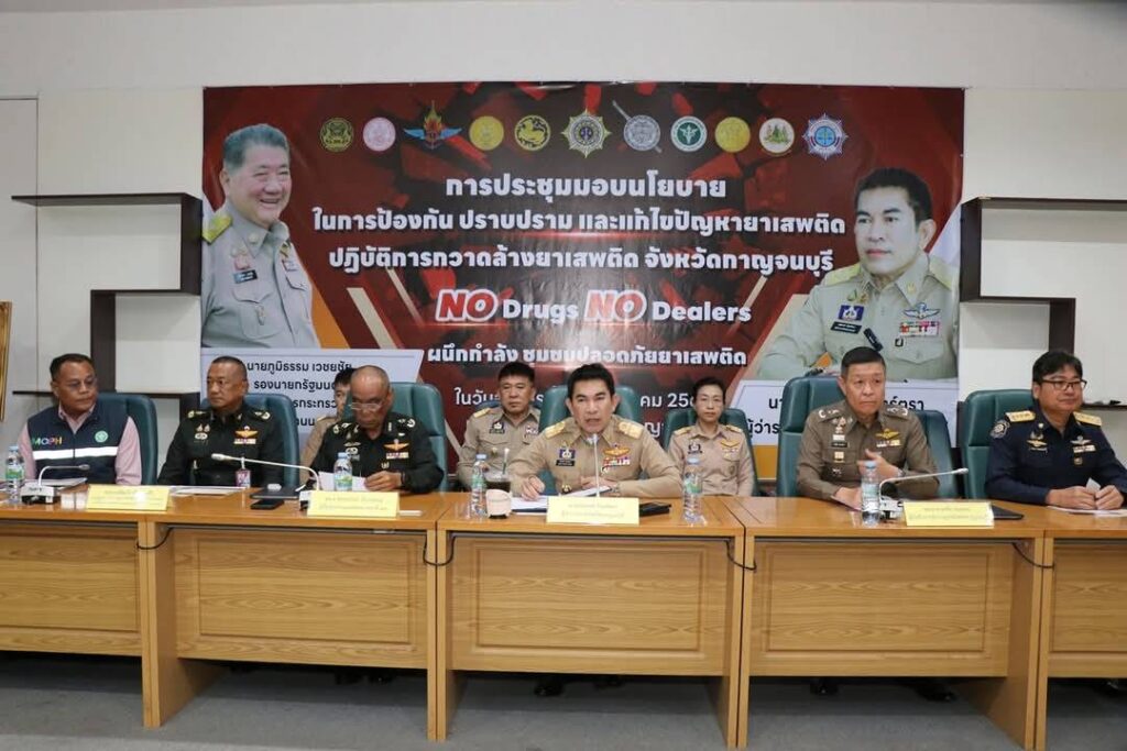 จังหวัดกาญจนบุรี โดยศูนย์อำนวยการป้องกันและปราบปรามยาเสพติดจังหวัดกาญจนบุรี รวมไปถึงอำเภอ องค์กรปกครองส่วนท้องถิ่น ทหาร ตำรวจ ทุกภาคส่วนที่เกี่ยวข้อง ร่วมกันผลักดันวาระการแก้ไขปัญหายาเสพติดของรัฐบาล ซึ่งเป็นวาระแห่งชาติ ให้เป็นวาระของจังหวัด อำเภอ และหมู่่บ้าน/ชุมชน ทั่วประเทศ ผ่านปฏิบัติการกวาดล้างยาเสพติด “No Drugs No Dealers” ผนึกกำลัง ชุมชนปลอดยาเสพติด และประกาศตนเป็น “หมู่บ้านชุมชนปลอดยาเสพติด” ที่จะต้องไม่มีทั้งผู้ค้าและผู้เสพ เพื่อขับเคลื่อนการแก้ไขปัญหายาเสพติดให้ครบถ้วนทุกมิติ นับตั้งแต่การป้องกัน ไม่ให้ยาเสพติดเข้าสู่ประเทศ การปราบปรามการแพร่ระบาดของยาเสพติดในชุมชน ตลอดจนการฟื้นฟูคนดีกลับสู่สังคม