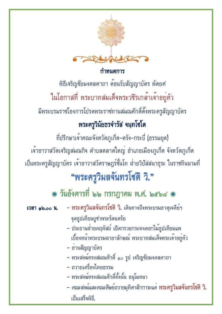 ร่วมงานพิธีเจริญชัยมงคลคาถา ต้อนรับสัญญา พัดยศ ในโอกาสที่ พระบาทสมเด็จพระวชิรเกล้าเจ้าอยู่หัว มีพระบรมราชโองการโปรดพระราชทานสมณศักดิ์ตั้งพระครูสัญญาบัตร "พระครูวินัยธรจำรัส จนทฺโชโต" ที่ปรึกษาเจ้าคณะจังหวัดภูเก็ต -ตรัง-กระบี่(ธรรมยุต) เจ้าอาวาสวัดเจริญสมณกิจ(วัดหลังศาล) ตำบลตลาดใหญ่ อำเภอเมืองภูเก็ต จังหวัดภูเก็ต เป็นพระครูสัญญาบัตร เจ้าอาวาสวัดราษฏร์ชั้นโท ฝ่ายวิปัสสนาธุระ ในราชทินนามที่