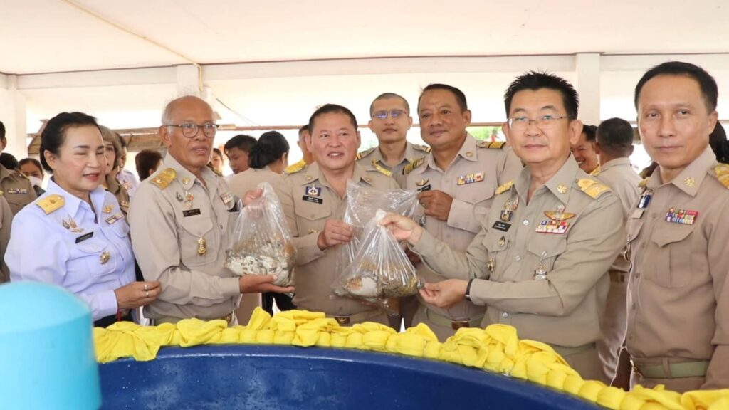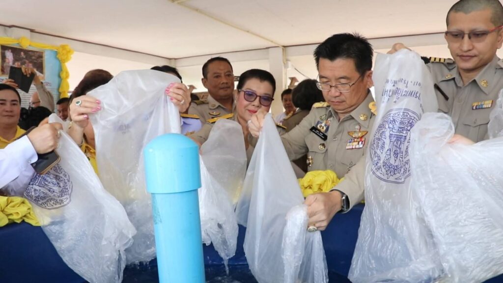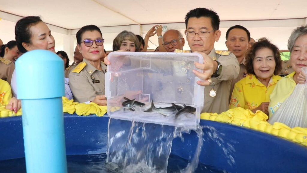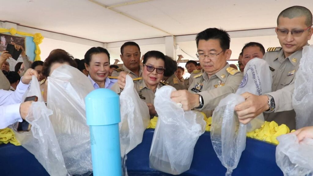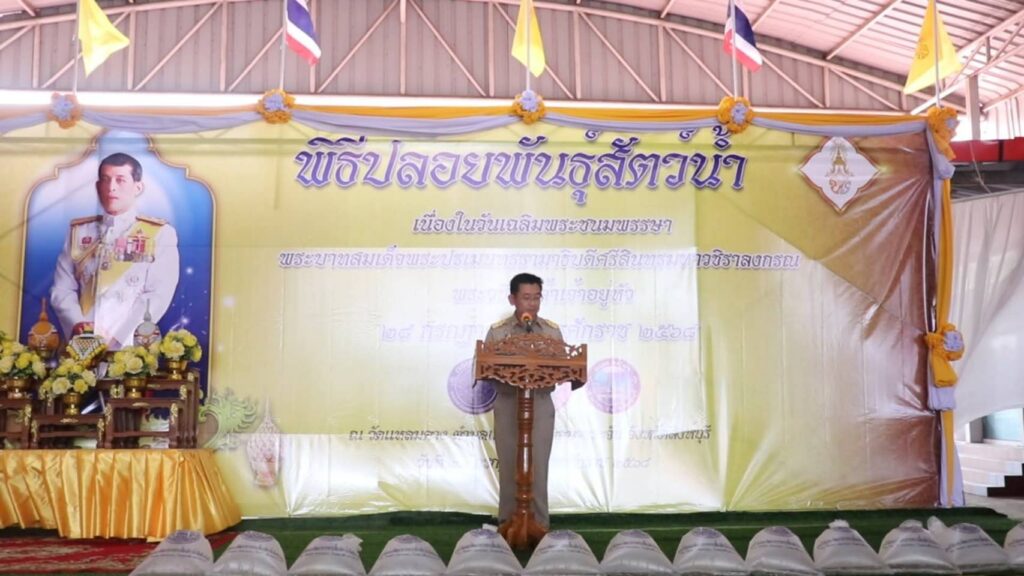 วันพุธที่ 23 กรกฏาคม 2568 เวลา 9.00 น.นายสุเมธ ธีรนิติ ผู้ว่าราชการจังหวัดสิงห์บุรีเป็นประธานในพิธีปล่อยพันธุ์สัตว์น้ำเฉลิมพระเกียรติเนื่องในวันเฉลิมพระชนมพรรษา พระบาทสมเด็จพระปรเมนทรรามาธิบดีศรีสินทรมหาวชิราลงกรณ พระวชิรเกล้าเจ้าอยู่หัว ณ วัดแหลมคาง บริเวณลำแม่ลา หมู่ที่ 2 ตำบลแม่ลา อำเภอบางระจัน จังหวัดสิงห์บุรี โดย นางสุพัตรา เผือกจีน ประมงจังหวัดสิงห์บุรี นายอำเภอค่ายบางระจัน หัวหน้าส่วนราชการ นักเรียน และประชาชนในพื้นที่ร่วมปล่อยพันธุ์สัตว์น้ำ ได้แก่พันธุ์ปลาตะเพียนขาว 195,000 ตัว ปลาดุกอุย 5,000 ตัว ปลาตะเพียนทอง 99 ตัว ปลาบึก 74 ตัว พ่อแม่พันธุ์กบ 9 คู่ รวมจำนวนทั้งสิ้น 200,074 ตัว