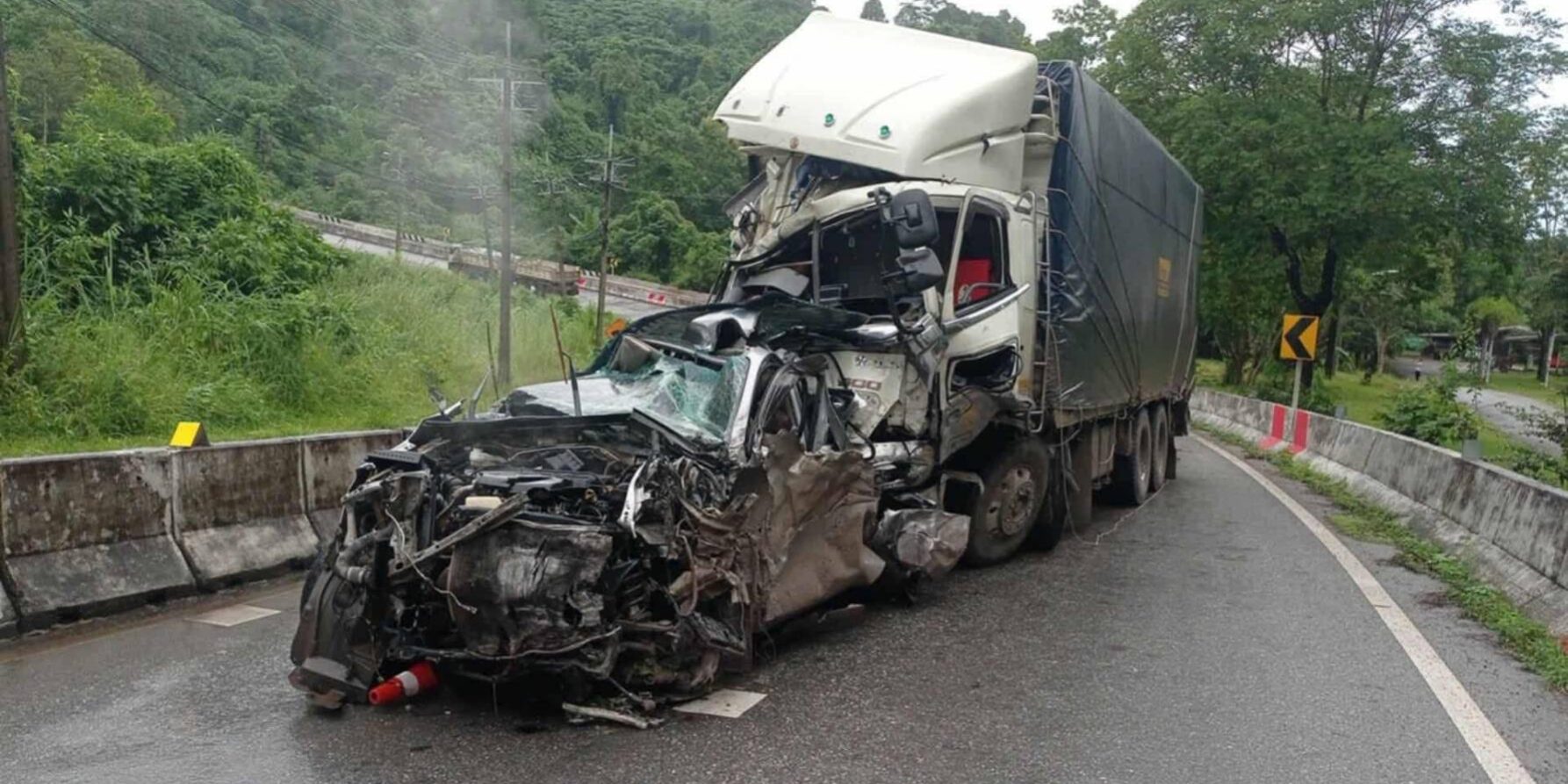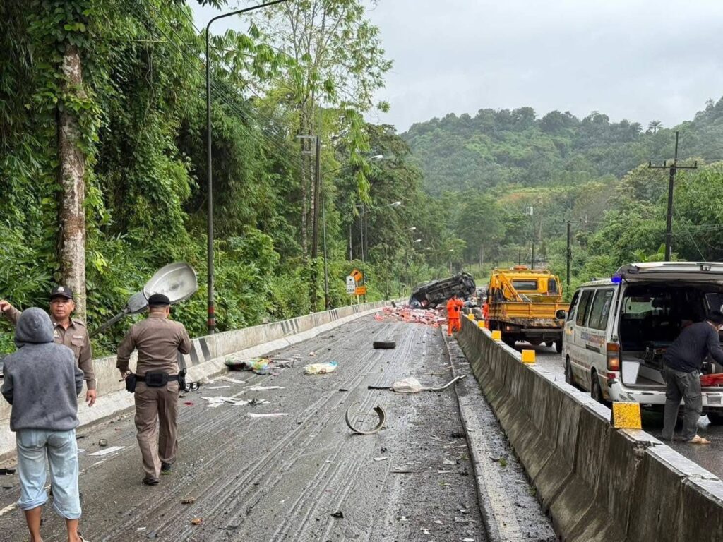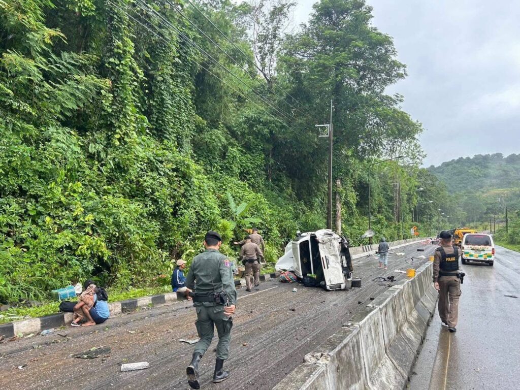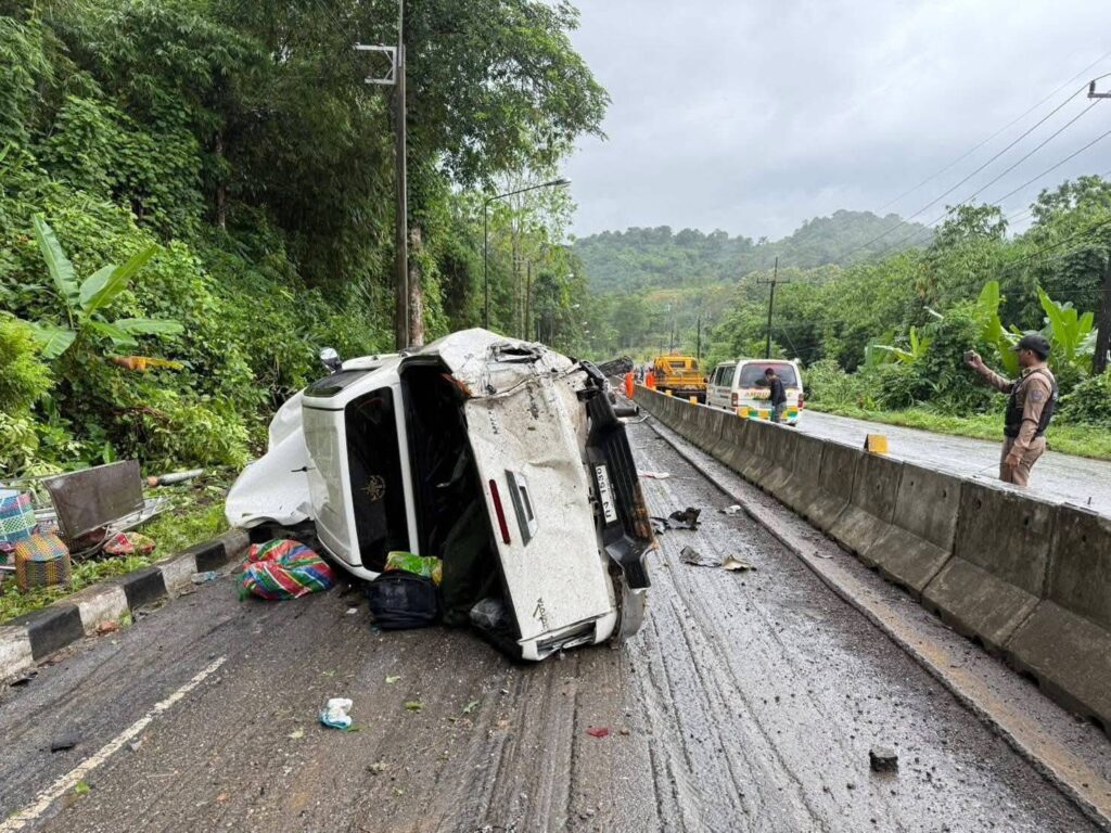 วันนี้ 23 ก.ค. 2567 ผู้สื่อข่าวรายงานว่า เมื่อเวลา 09.40 น. ที่บริเวณเนินยาว ถนนเส้น 323 อำเภอสังขละบุรี เกิดอุบัติเหตุรถยนต์กระบะบรรทุกสินค้าจำพวกผลไม้และอาหารสด จากตัวอำเภอทองผาภูมิ เพื่อนำไปส่งชายแดนเพื่อนบ้านเมียนมา ระหว่างช่วงเนินยาว ในพื้นที่เกิดฝนตกทำให้ถนนลื่น รถบรรทุกได้ไหลลงมา ชนกับรถยนต์ที่บรรทุกแรงงานเมียนมา เพื่อนำไปส่งออกกลับไปชายแดนเมียนมา จำนวน 5 คัน เบื้องต้นทำให้มีผู้บาดเจ็บและเสียชีวิต เจ้าหน้าที่ทุกฝ่ายเร่งทำการช่วยเหลือเพื่อนำร่างผู้ที่บาดเจ็บส่งเสียงร้องขอความช่วยเหลือเป็นการเร่งด่วน