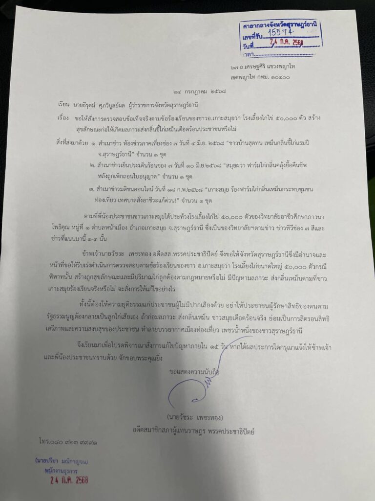 ข้าพเจ้านายวัชระ เพชรทอง อดีตสส.พรรคประชาธิปัตย์ จึงขอให้จังหวัดสุราษฎร์ธานีซึ่งมีอำนาจและหน้าที่ขอให้รีบเร่งดำเนินการตรวจสอบตามข้อร้องเรียนของชาว อ.เกาะสมุยว่า โรงเลี้ยงไก่ขนาดใหญ่ ๕๐,๐๐๐ ตัวกรณีพิพาทนั้น สร้างถูกสุขลักษณะและมีปริมาณไก่ถูกต้องตามกฎหมายหรือไม่ มีปัญหามลภาวะ ส่งกลิ่นเหม็นตามที่ชาวเกาะสมุยร้องเรียนจริงหรือไม่ จะสั่งการให้แก้ไขอย่างไร