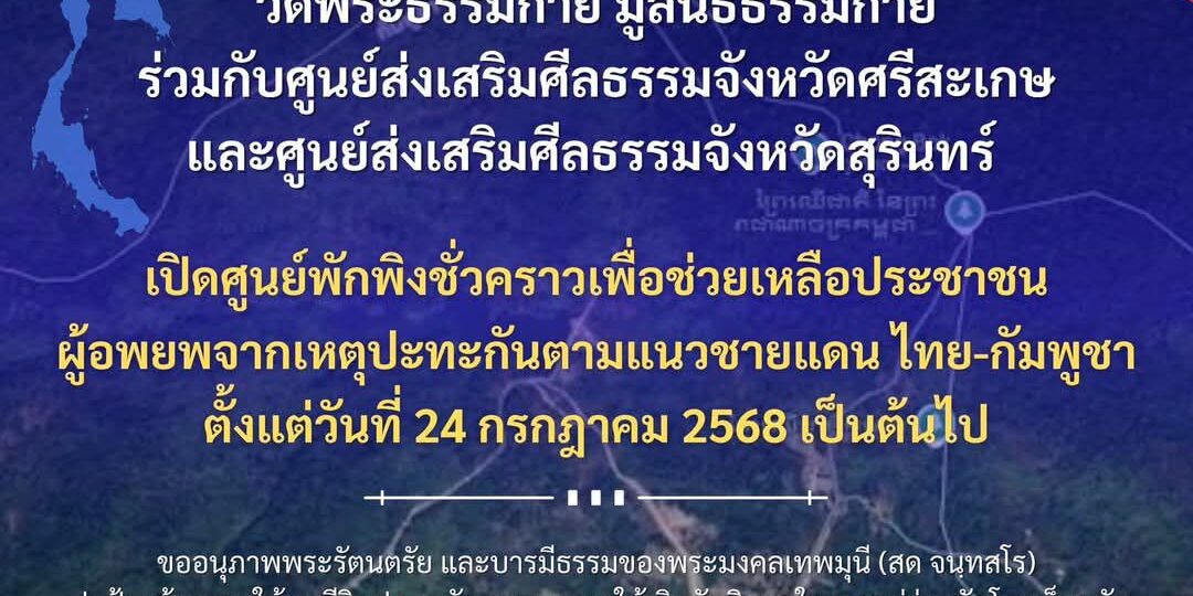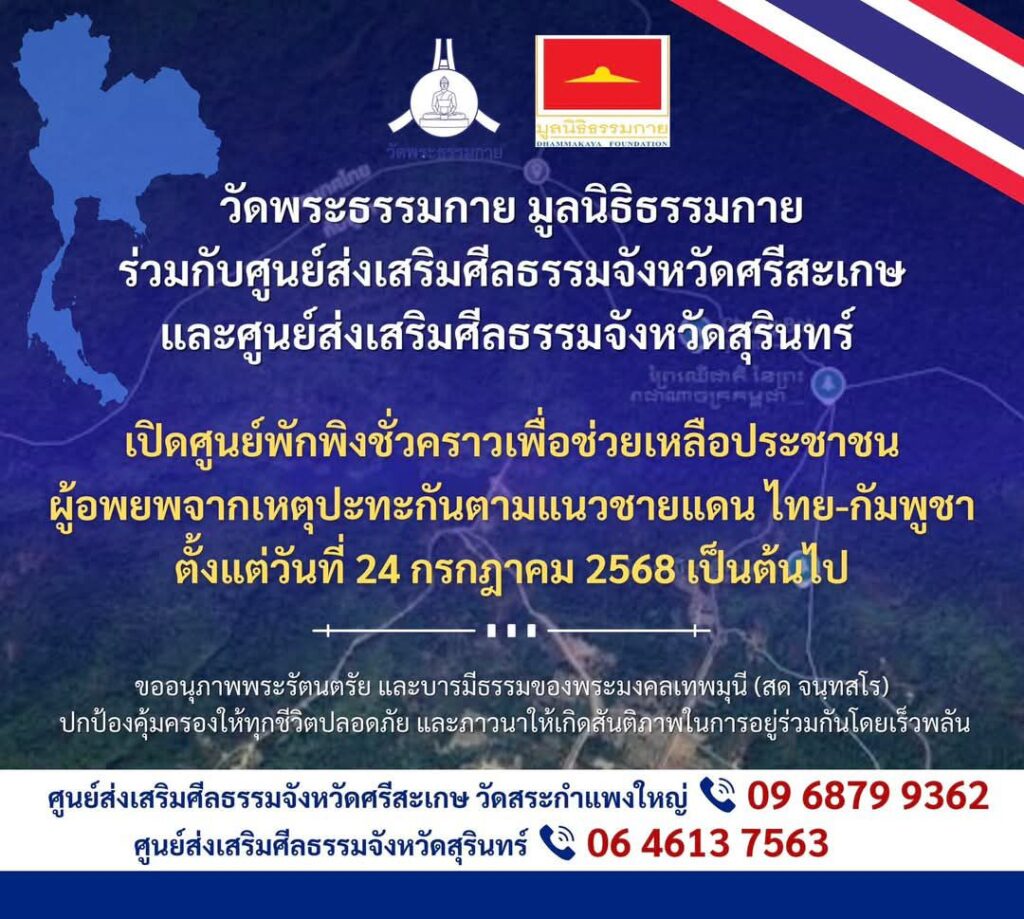 วันที่ 24 กรกฎาคม 2568 พระครูสมุห์สนิทวงศ์ วุฑฺฒิวํโส ผู้อำนวยการสำนักสื่อสารองค์กร วัดพระธรรมกาย จังหวัดปทุมธานี เปิดเผยว่า วัดพระธรรมกาย และมูลนิธิธรรมกาย ร่วมกับศูนย์ส่งเสริมศีลธรรมจังหวัดศรีสะเกษ และศูนย์ส่งเสริมศีลธรรมจังหวัดสุรินทร์ เปิด “ศูนย์พักพิงชั่วคราว” เพื่อให้การช่วยเหลือประชาชนผู้อพยพจากเหตุการณ์ปะทะกันบริเวณแนวชายแดนไทย–กัมพูชา ซึ่งเกิดขึ้นต่อเนื่องในช่วงที่ผ่านมา