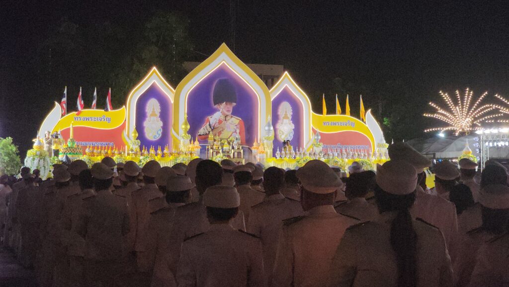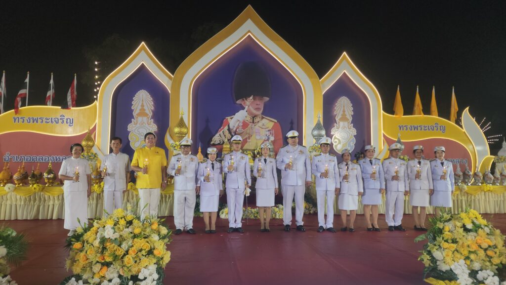 โดยน.ส.อภิสรา เกษอินทร์ นายอำเภอคลองหลวง เป็นประธานประกอบพิธีวางพานพุ่ม และจุดเทียนถวายพระพรชัยมงคล กล่าวคำอาเศียรวาท และร่วมขับร้องบทเพลงสรรเสริญพระบารมี เพื่อแสดงถึงความจงรักภักดี ต่อสถาบันพระมหากษัตริย์ และเทิดพระเกียรติ แด่พระบาทสมเด็จพระปรเมนทรรามาธิบดีศรีสินทรมหาวชิราลงกรณ พระวชิรเกล้าเจ้าอยู่หัว ซึ่งพระองค์ได้ทรงปฏิบัติบำเพ็ญพระราชกรณียกิจนานัปการ เพื่อประโยชน์อเนกอนันต์แก่ปวงประชาชนชาวไทย และสร้างความเจริญก้าวหน้าแก่ประเทศชาติ โดยมี ข้าราชการประชาชนผู้นำชุมในอำเภอทุกหน่วยงานเข้าร่วมพิธีอย่างพร้อมเพียง