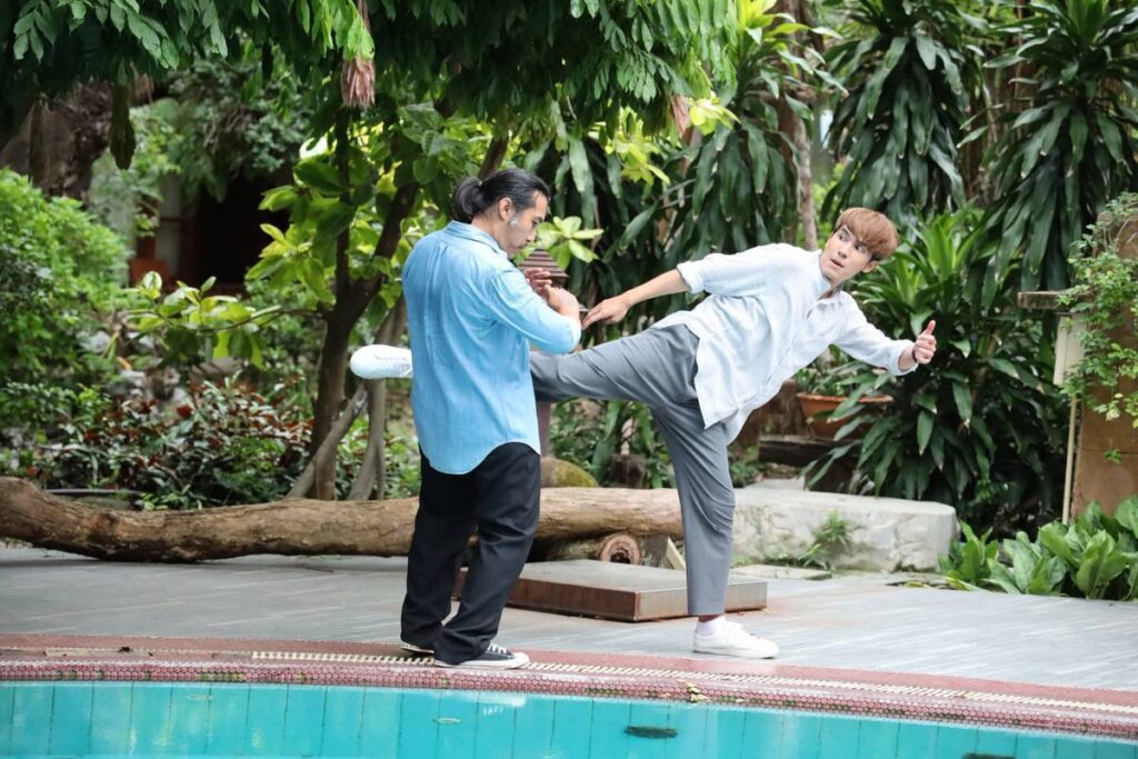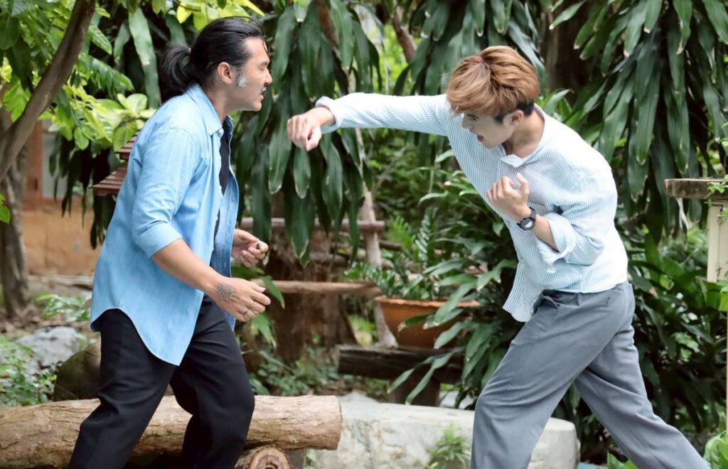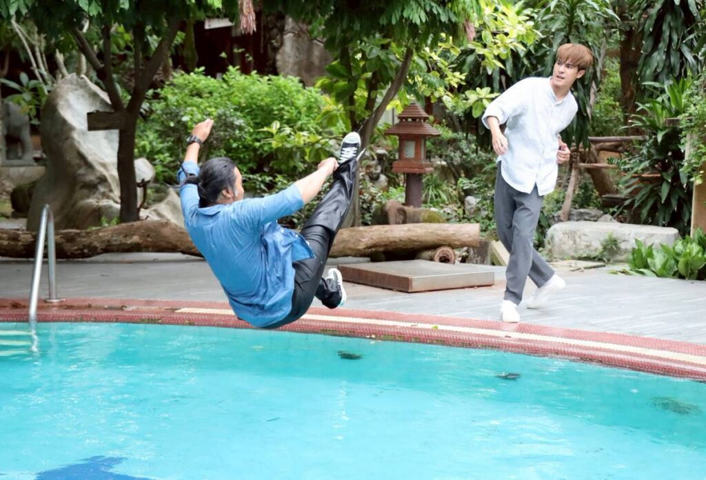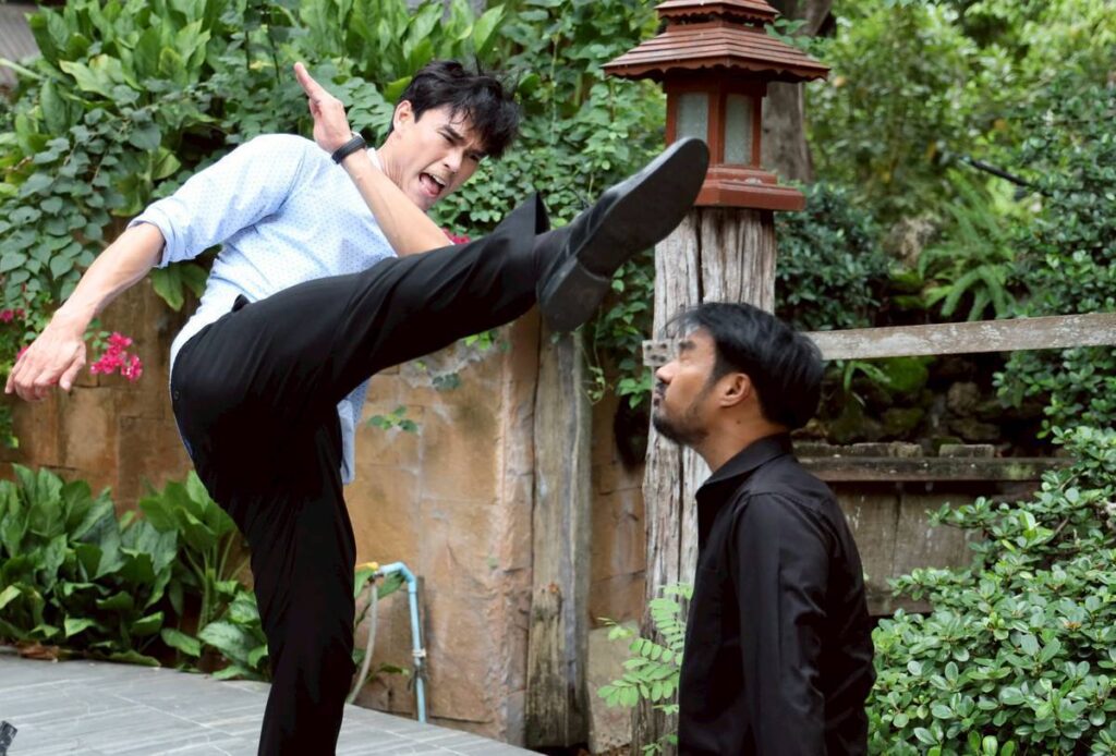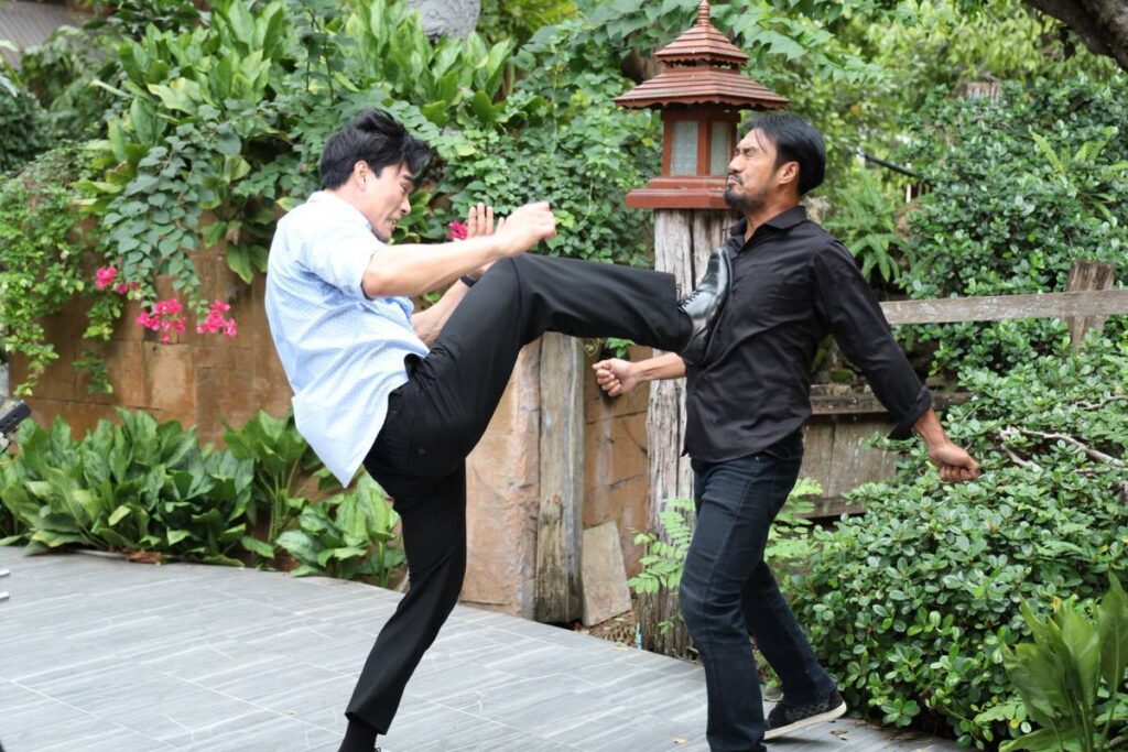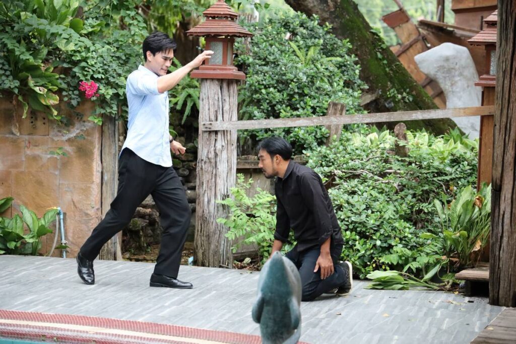 จากนั้นผู้กำกับฯ และทีมงานก็ย้ายมาถ่ายทำคิวบู๊ด้านนอกที่สองหนุ่มต้องปะทะกับลูกน้องเสี่ย ฉากนี้ต้องมีการซักซ้อมคิวบู๊กันก่อน ซึ่งก็ไม่ยาก เพราะสองหนุ่มซักซ้อมกับทีมนักแสดงคิวบู๊มาอย่างดี ฉากนี้ใช้เวลาถ่ายทำอยู่พักใหญ่ เพราะผู้กำกับฯ ถ่ายเจาะบู๊ทีละคน และแต่ละคนก็จะมีฉากจบบู๊สวยๆของตัวเอง ของหนุ่ม “ชอน” เอาแบบเตะเสยคางสลบ ส่วนหนุ่ม “ตรัย” เตะตกน้ำกันเลย