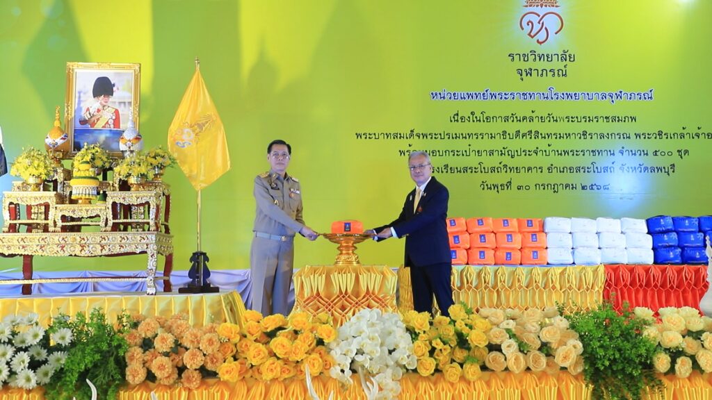 วันที่ 30 กรกฎาคม 2568 เวลา 09.30 น. โรงเรียนสระโบสถ์วิทยาคาร อำเภอสระโบสถ์ จังหวัดลพบุรี ดร.วัชระ ฉัตรวิริยะ รักษาการรองเลขาธิการราชวิทยาลัยจุฬาภรณ์ เป็นประธานเปิดหน่วยแพทย์พระราชทานโรงพยาบาลจุฬาภรณ์ เนื่องในโอกาสวันคล้าย พระบรมราชสมภพพระบาทสมเด็จพระบรมปรเมนทรรามาธิบดีศรีสินทรมหาวชิราลงกรณพระวชิรเกล้าเจ้าอยู่หัว พร้อมมอบกระเป๋ายาสามัญประจำบ้านพระราชทาน 500 ชุด ให้กับประชาชนที่มารับบริการหน่วยแพทย์พระราชทานโรงพยาบาลจุฬาภรณ์ และกระเป๋านักเรียนพร้อมสมุดมอบ