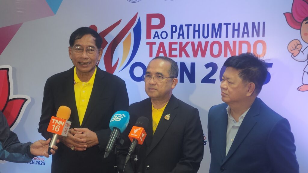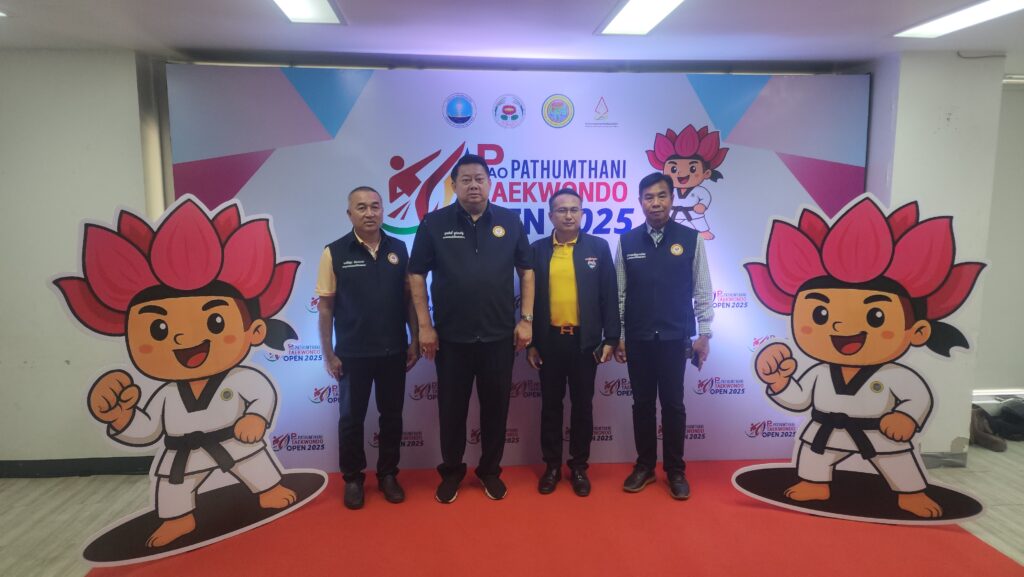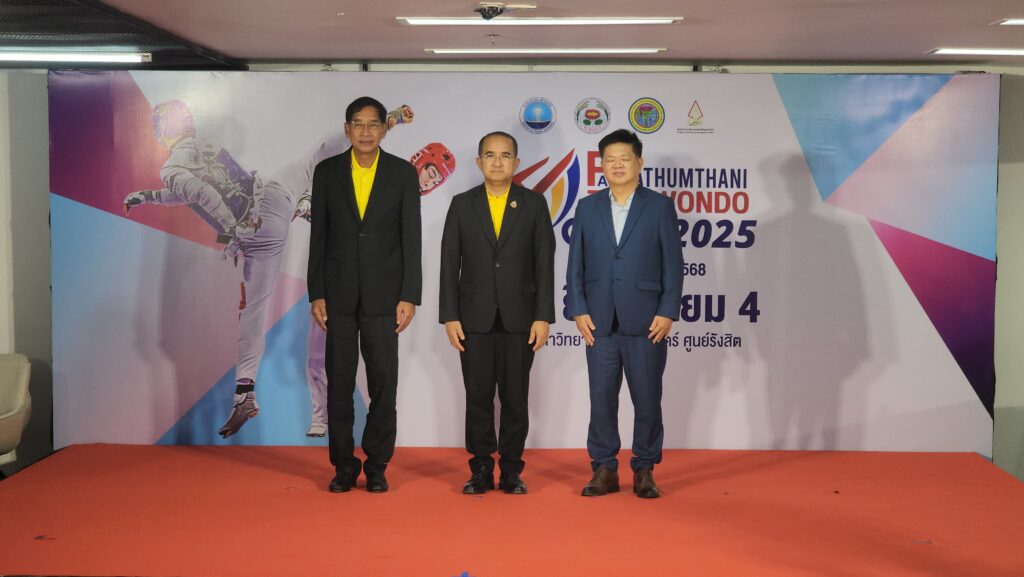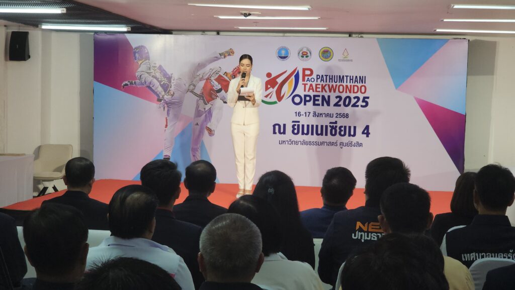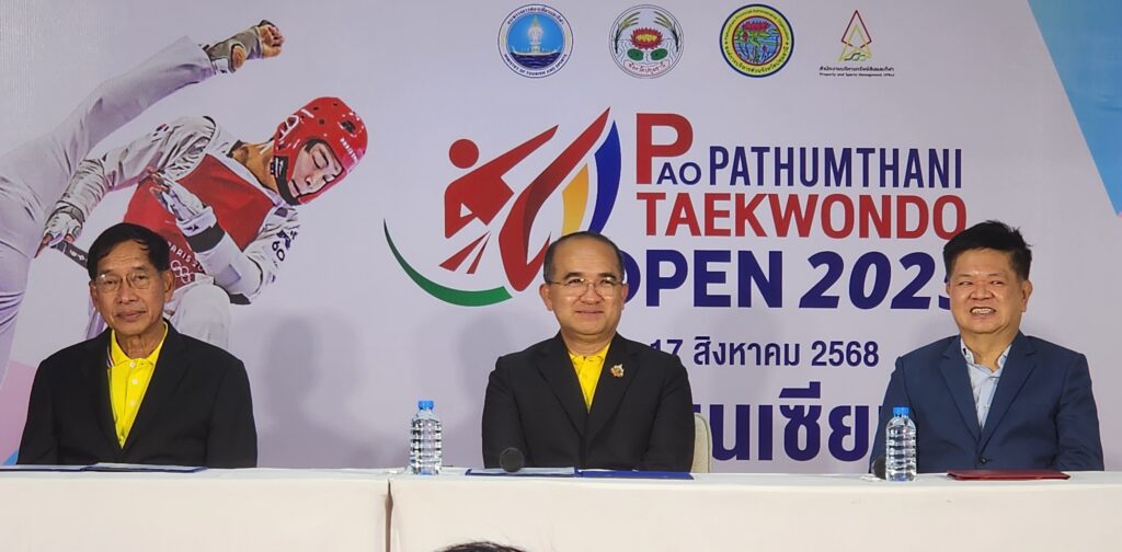 เมื่อเวลา 13.30 น. วันที่ 1 สิงหาคม 2568 ที่ณ ห้องประชุม VIP ศูนย์กีฬาทางน้ำ มหาวิทยาลัยธรรมศาสตร์ ศูนย์รังสิต จังหวัดปทุมธานี นายสมคิด จันทมฤก ผู้ว่าราชการจังหวัดปทุมธานี พร้อมด้วย พลตำรวจโทคำรณวิทย์ ธูปกระจ่าง นายกองค์การบริหารส่วนจังหวัดปทุมธานี และ นายยรรยง อัครจินดานนท์ ผู้อำนวยการสำนักงานบริหารทรัพย์สินและกีฬา มหาวิทยาลัยธรรมศาสตร์ ร่วมกันแถลงข่าวโครงการแข่งขันมหกรรมส่งเสริมความ เป็นเลิศกีฬาเทควันโด จังหวัดปทุมธานี โดยมี นายยุทธศักดิ์ ชูประเสริฐ นายกเทศมนตรีเมืองคลองหลวง ร.ต.อ.ดร.ตรีลุพธ์ ธูปกระจ่าง นายกเทศมนตรีนครรังสิตผู้บริหาร อบจ.ปทุมธานี ผู้บริหารเทศบาลนครรังสิต ผู้บริหารเทศบาลเมืองคลองหลวง และหัวหน้าส่วนราชการ เข้าร่วมงาน