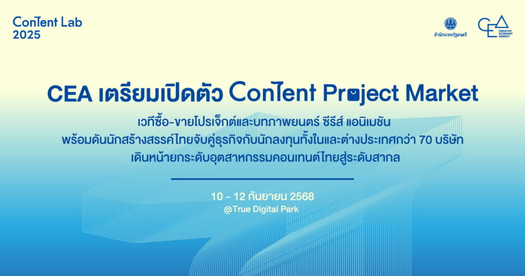 สำนักงานส่งเสริมเศรษฐกิจสร้างสรรค์ (องค์การมหาชน) หรือ CEA เดินหน้ายกระดับอุตสาหกรรมคอนเทนต์ไทยสู่เวทีสากล ด้วยการจัดงาน Content Project Market หรือตลาดซื้อขายคอนเทนต์ ซึ่งจัดขึ้นเป็นปีที่ 2 ภายใต้โครงการ “Content Lab 2025 สร้างสรรค์คอนเทนต์ไทย ดันไกลสู่สากล” จุดประกายเวทีซื้อขายและจับคู่ธุรกิจคอนเทนต์แห่งใหม่ ที่จะกลายเป็นหัวใจของการผลักดันคอนเทนต์ไทยสู่ระดับนานาชาติ พร้อมส่งเสริมซอฟต์พาวเวอร์ โดยงาน Content Project Market จะจัดขึ้นในวัน 10 – 12 กันยายน 2568 ณ True Digital Park (East) ชั้น 6 – 7