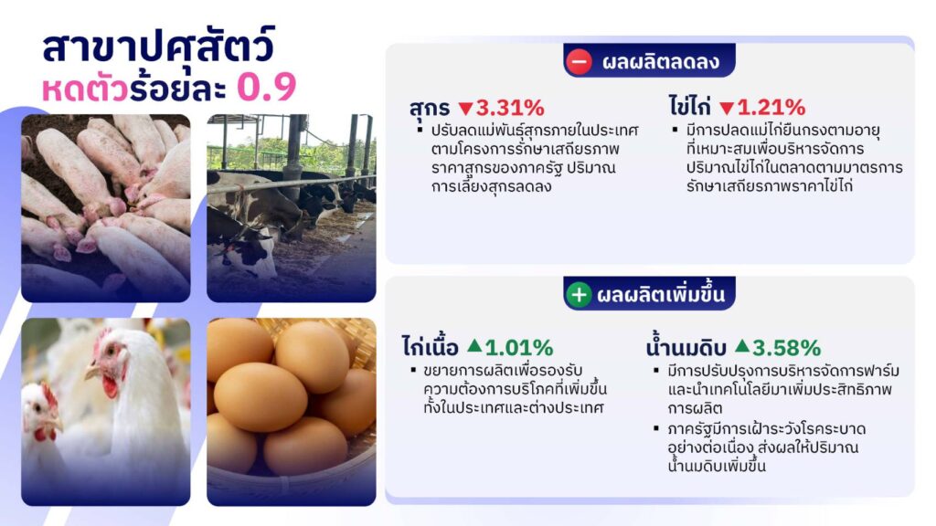 -สาขาปศุสัตว์ หดตัวร้อยละ 0.9 โดยสุกรและไข่ไก่ มีผลผลิตลดลงจากการดำเนินโครงการรักษาเสถียรภาพราคาของภาครัฐ โดยมีการปรับลดแม่พันธุ์สุกรภายในประเทศ และการขอความร่วมมือให้เกษตรกรปลดแม่ไก่ยืนกรงตามอายุที่เหมาะสมเพื่อรักษาเสถียรภาพราคา ทำให้ปริมาณผลผลิตที่ออกสู่ตลาดลดลง อย่างไรก็ตาม ปริมาณไข่ไก่ยังคงเพียงพอต่อการบริโภคภายในประเทศ ไก่เนื้อและน้ำนมดิบ มีการผลิตเพิ่มขึ้นตามความต้องการบริโภคในประเทศและการส่งออกที่ขยายตัวอย่างต่อเนื่อง รวมถึงการที่เกษตรกรมีการปรับปรุงการบริหารจัดการฟาร์มและนำเทคโนโลยีมาใช้เพิ่มประสิทธิภาพการผลิต ประกอบกับภาครัฐมีการเฝ้าระวังโรคระบาดอย่างต่อเนื่อง