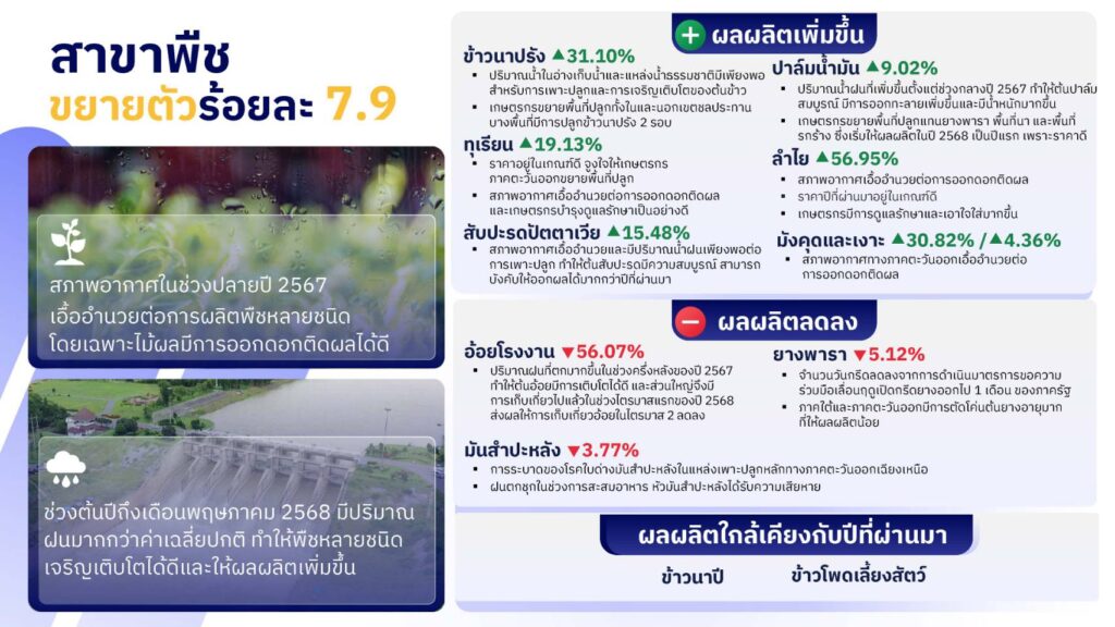 -สาขาพืช ขยายตัวร้อยละ 7.9 เนื่องจากสภาพอากาศในช่วงปลายปี 2567 เอื้ออำนวยต่อการผลิตพืชหลายชนิด โดยเฉพาะไม้ผลที่มีการออกดอกติดผลได้ดี ประกอบกับช่วงต้นปีถึงเดือนพฤษภาคม 2568 มีปริมาณฝนมากกว่าค่าเฉลี่ยปกติ ทำให้พืชหลายชนิดเจริญเติบโตได้ดีและให้ผลผลิตเพิ่มขึ้น สินค้าพืชที่มีผลผลิตเพิ่มขึ้น ได้แก่ ข้าวนาปรัง เนื่องจากปริมาณน้ำในอ่างเก็บน้ำและแหล่งน้ำธรรมชาติมีเพียงพอสำหรับการเพาะปลูกและการเจริญเติบโตของต้นข้าว เกษตรกรจึงขยายพื้นที่เพาะปลูกเพิ่มขึ้นทั้งในและนอกเขตชลประทาน บางพื้นที่มีการปลูกข้าวนาปรังถึง 2 รอบ ประกอบกับราคาข้าวในช่วงที่ผ่านมาอยู่ในเกณฑ์ดี จูงใจให้เกษตรกรใส่ปุ๋ยและบำรุงรักษามากขึ้น ส่งผลให้ผลผลิตต่อไร่เพิ่มสูงขึ้น สับปะรดปัตตาเวีย ผลผลิตเพิ่มขึ้น เนื่องจากสภาพอากาศเอื้ออำนวยและมีปริมาณน้ำฝนเพียงพอต่อการเพาะปลูก ทำให้ต้นสับปะรดมีความสมบูรณ์ สามารถบังคับให้ออกผลได้มากกว่าปีที่ผ่านมา อีกทั้งไม่ประสบปัญหาภัยแล้งหรือฝนทิ้งช่วงอย่างที่เกิดขึ้นในปีก่อนหน้า ส่งผลให้พื้นที่เก็บเกี่ยวและผลผลิตรวมทั้งประเทศเพิ่มขึ้น ปาล์มน้ำมัน ผลผลิตเพิ่มขึ้น เนื่องจากราคาปาล์มในปี 2565 อยู่ในเกณฑ์ดี ทำให้เกษตรกรขยายพื้นที่ปลูกแทนยางพารา พื้นที่นา และพื้นที่รกร้าง ซึ่งเริ่มให้ผลผลิตในปี 2568 เป็นปีแรก ประกอบกับปริมาณน้ำฝนที่เพิ่มขึ้นตั้งแต่ช่วงกลางปี 2567 ทำให้ต้นปาล์มสมบูรณ์ มีการออกทะลายเพิ่มขึ้นและมีน้ำหนักมากขึ้น ลำไย ทุเรียน มังคุด และเงาะ เพิ่มขึ้นอย่างมาก โดยเฉพาะในภาคตะวันออก เนื่องจากสภาพอากาศเอื้ออำนวยต่อการออกดอกติดผล ไม่ร้อนและแห้งแล้งเหมือนปีที่ผ่านมา ราคาที่อยู่ในเกณฑ์ดีต่อเนื่องหลายปี จูงใจให้เกษตรกรขยายพื้นที่และดูแลรักษาเป็นอย่างดี ประกอบกับในปีที่ผ่านมาไม้ผลส่วนใหญ่ให้ผลผลิตน้อย ทำให้มีการพักต้นสะสมอาหาร ส่งผลให้ปีนี้มีความสมบูรณ์และให้ผลผลิตได้มากขึ้น สินค้าพืชที่มีผลผลิตลดลง ได้แก่ มันสำปะหลัง ผลผลิตลดลงจากผลกระทบของการระบาดของโรคใบด่าง