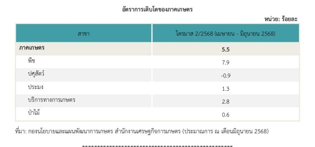 นายฉันทานนท์ วรรณเขจร เลขาธิการสำนักงานเศรษฐกิจการเกษตร (สศก.) กระทรวงเกษตรและสหกรณ์ เปิดเผยถึงภาวะเศรษฐกิจการเกษตรในไตรมาส 2 ปี 2568 (เมษายน-มิถุนายน) ขยายตัวถึงร้อยละ 5.5 เมื่อเทียบกับช่วงเดียวกันของปี 2567 โดยมีปัจจัยสนับสนุนจากปริมาณฝนที่เพิ่มขึ้นตั้งแต่ช่วงปลายปี 2567 ต่อเนื่องมาถึงช่วงต้นปี 2568 ส่งผลให้ปริมาณน้ำในอ่างเก็บน้ำและแหล่งน้ำตามธรรมชาติมีเพียงพอสำหรับการเพาะปลูกพืชในช่วงฤดูแล้ง ประกอบกับสภาพอากาศโดยทั่วไปเอื้ออำนวยต่อการเจริญเติบโตของพืชผล เกษตรกรจึงมีการขยายพื้นที่เพาะปลูกในพื้นที่ที่เคยปล่อยว่าง รวมทั้งมีการบำรุงดูแลและเฝ้าระวังโรคมากขึ้น ส่งผลให้สาขาพืชซึ่งเป็นสาขาการผลิตหลักขยายตัวได้ดี และส่งผลบวกต่อเนื่องไปยังสาขาบริการทางการเกษตร ขณะที่สาขาประมงและสาขาป่าไม้ขยายตัวจากความต้องการของตลาดที่เพิ่มขึ้น ส่วนสาขาปศุสัตว์มีทิศทางหดตัว สำหรับรายละเอียดการผลิตในแต่ละสาขา มีดังนี้