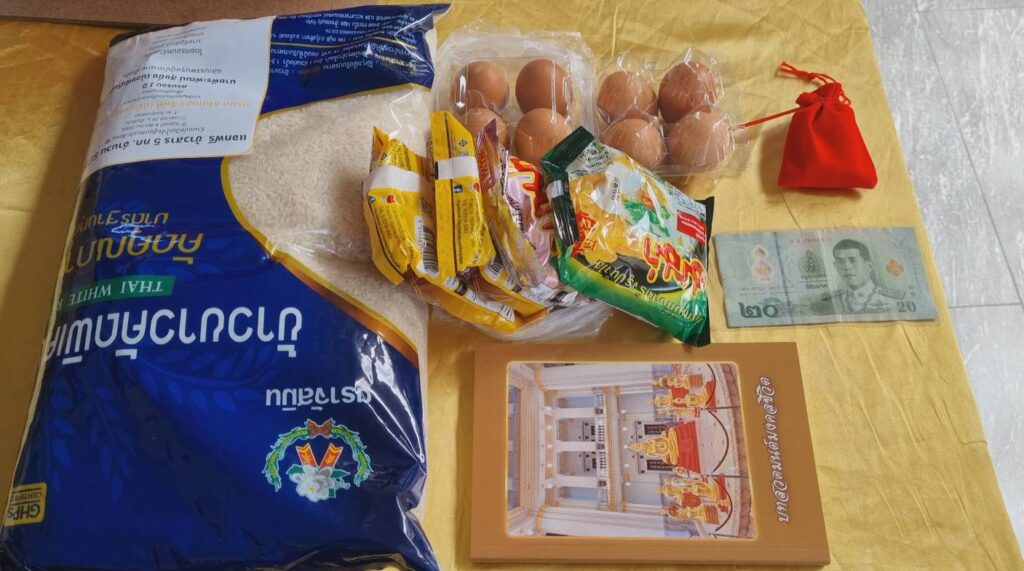 โดยภายในชุดประกอบด้วย: ข้าวสาร 5 กิโลกรัม,ไข่ไก่ + บะหมี่กึ่งสำเร็จรูป, หนังสือธรรมะ “มงคลชีวิต”,ธนบัตรขวัญถุง,พระของขวัญ (หลวงพ่อโสธร,หลวงปู่ทวด)