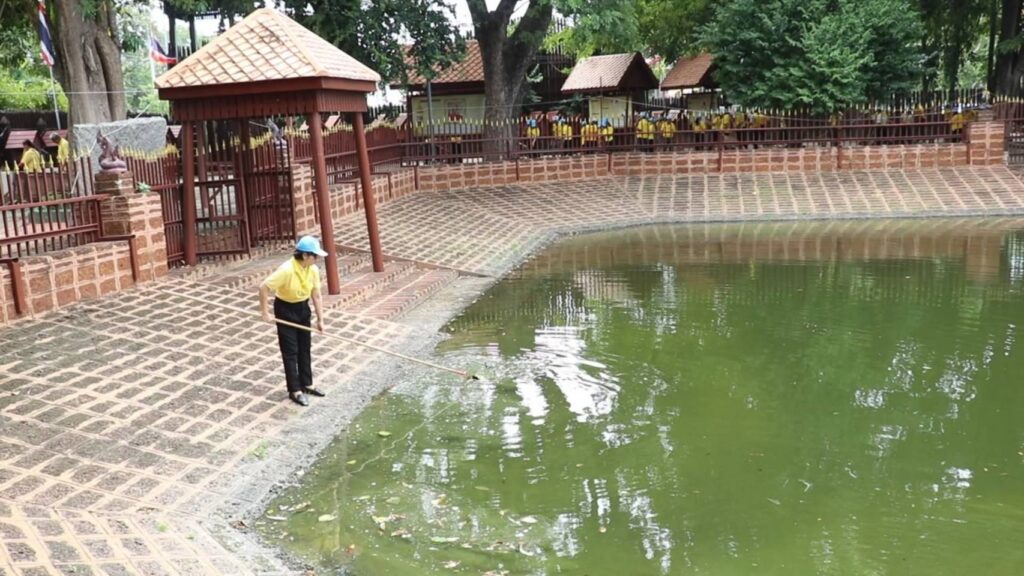 โดยการพัฒนาทำความสะอาด ตักใบไม้ในสระน้ำศักสิทธิ์ เก็บกวาดขยะ ปรับปรุงภูมิทัศน์ รอบวัดโพธิ์เก้าต้น เพื่อให้เกิดความสวยงามเป็นระเบียบเรียบร้อย เพราะวัดโพธิ์เก้าต้นเป็นแหล่งท่องเที่ยวและเป็นสถานที่ศักสิทธิ์ของชาวจังหวัดสิงห์บุรีที่นักท่องเที่ยวต้องเดินทางมากราบไหว้สักการะพระอาจารย์ธรรมโชติและชาวบ้านบางระจันรำลึกถึงวีรกรรมอันกล้าหาญที่รักษาผืนแผ่นดินไทยไว้ได้