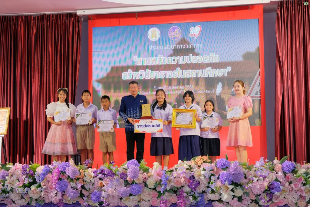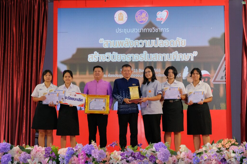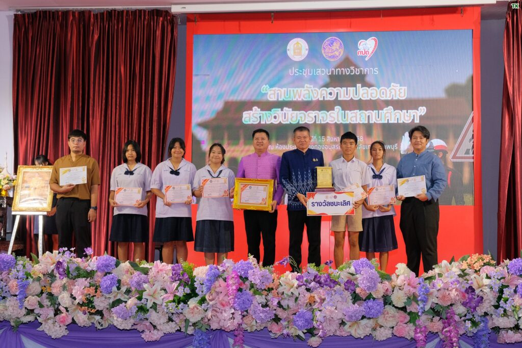 วันที่ 15 สิงหาคม 2568 เวลา 09.00 น. ที่ห้องประชุมเฟืองทองอนุสรณ์ วิทยาลัยเทคนิคลพบุรี ว่าที่ร้อยตรีทรงพล แป้นแก้ว รองผู้ว่าราชการจังหวัดลพบุรี เป็นประธานเปิดงานสัมมนาวิชาการ ความปลอดภัยในการใช้รถใช้ถนนของสถานศึกษาในจังหวัดลพบุรีและมอบเกียรติบัตรและโล่รางวัล พร้อมทุนการศึกษาให้กับผู้ชนะการประกวดคลิปสั้นรณรงค์ป้องกัน และลดอุบัติเหตุจากรถจักรยานยนต์ของนักเรียน นักศึกษา จังหวัดลพบุรี ตามโครงการ “วัฒนธรรมความปลอดภัย สร้างวินัยจราจรในสถานศึกษา” โดยมี นายวัชรพงศ์ พิพัฒน์สุริยวงศ์ ศึกษาธิการจังหวัดลพบุรี พร้อมด้วย ผู้บริหารสถานศึกษา คณะครู อาจารย์ นักเรียน นักศึกษา จากโรงเรียนต่าง ๆ ในพื้นที่จังหวัดลพบุรีเข้าร่วม
