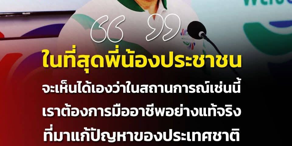 ในที่สุด พี่น้องประชาชน จะเห็นได้เองว่าในสถานการณ์เช่นนี้เราต้องการมืออาชีพอย่างแท้จริงที่มาแก้ปัญหาของประเทศชาติ ไม่ใช่เอามือใหม่มาเอาประเทศเป็นหนูทดลอง “
