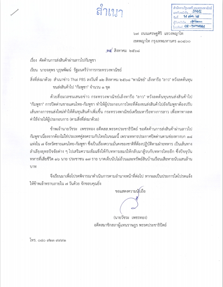 หนังสือระบุว่าตามที่กระทรวงพาณิชย์เล็งหารือ “ลาว” หวังลดต้นทุนขนส่งสินค้าไป “กัมพูชา” การปิดด่านชายแดนไทย-กัมพูชา ทำให้ผู้ประกอบการไทยที่ต้องขนส่งสินค้าไปยังกัมพูชาต้องปรับเส้นทางการขนส่งใหม่ทำให้ต้นทุนสินค้าเพิ่มขึ้น กระทรวงพาณิชย์เตรียมหารือทางการลาว เพื่อหาทางลดค่าใช้จ่ายให้ผู้ประกอบการนั้น