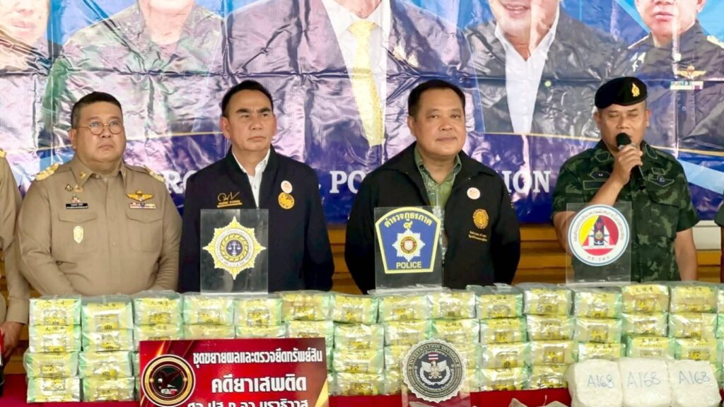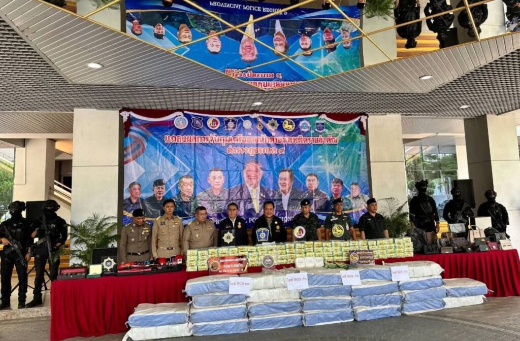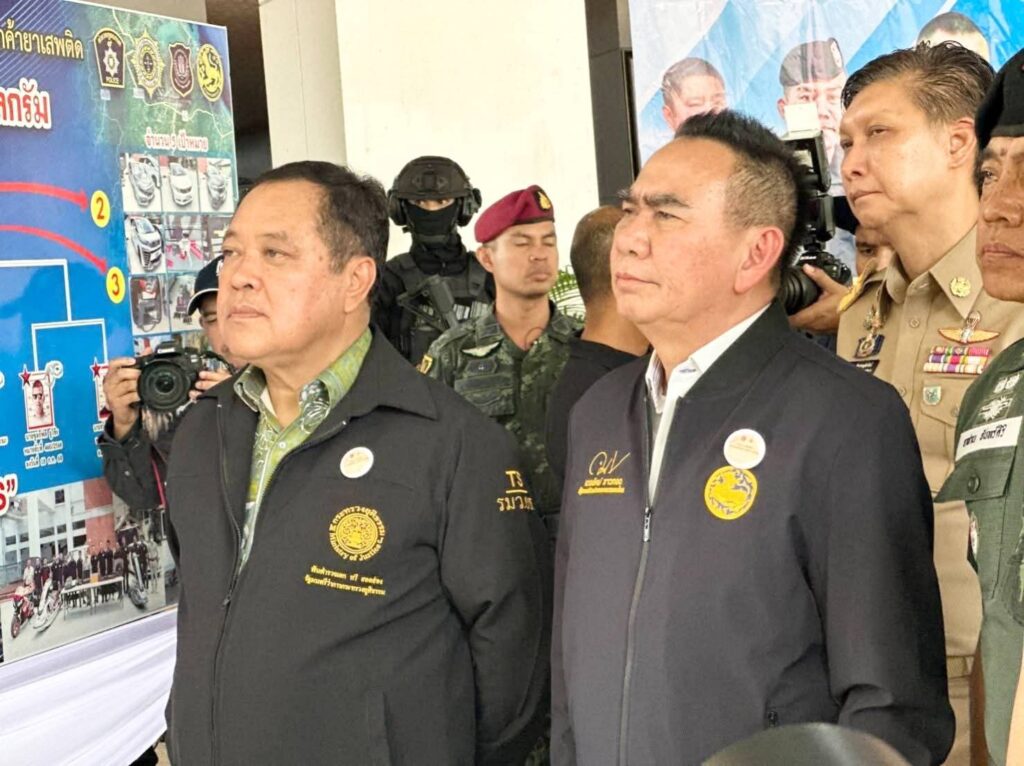 เมื่อวันที่ 16 ส.ค.2568 เวลา 12.00 น. นายภูมิธรรม เวชยชัย รองนายกรัฐมนตรีและรัฐมนตรีว่าการกระทรวงมหาดไทย รักษาราชการแทนนายกรัฐมนตรี มอบหมายให้ พ.ต.อ.ทวี สอดส่อง รัฐมนตรีว่าการกระทรวงยุติธรรม พร้อมด้วยนายเดชอิศม์ ขาวทอง รัฐมนตรีช่วยว่าการกระทรวงมหาดไทย ลงพื้นที่จังหวัดยะลา เพื่อแถลงผลการจับกุมนักค้ายาเสพติดรายสำคัญในพื้นที่จังหวัดชายแดนภาคใต้ ณ ศูนย์ปฏิบัติการตำรวจแห่งชาติส่วนหน้า อ.ยะลา จ.ยะลา โดยมี พ.ต.ท.วรรณพงษ์ คชรักษ์ เลขาธิการ ศอ.บต.,พล.ท.ไพศาล หนูสังข์ แม่ทัพภาคที่ 4,พล.ต.ต.อาชาน จันทร์ศิริ รองผู้บัญชาการตำรวจภูธรภาค 9 นายวิชาญ ชัยเศรษฐสัมพันธ์ รองผู้ว่าราชการจังหวัดนราธิวาส และผู้แทน ผอ.ป.ป.ส. ภาค 9 ร่วมแถลงข่าว