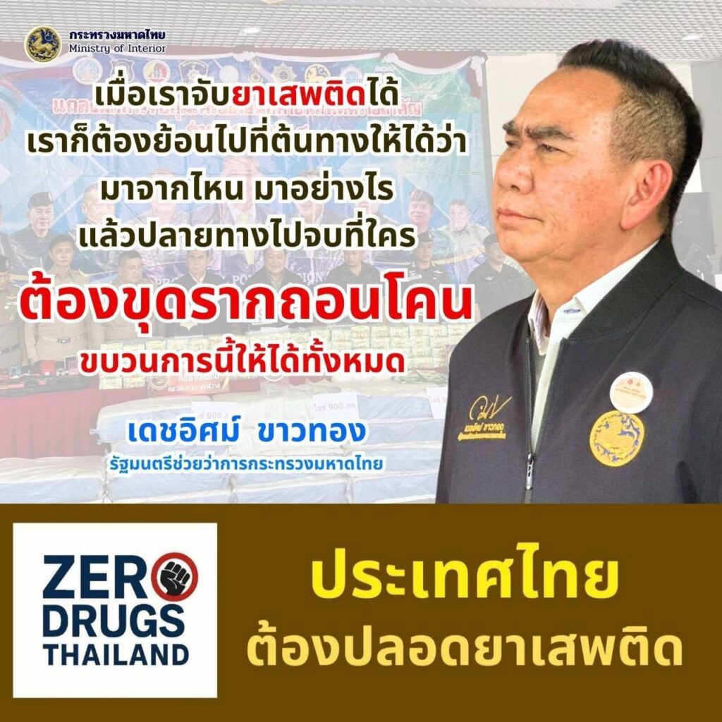 นายเดชอิศม์ฯ กล่าวว่า ปัญหายาเสพติดเป็นปัญหาสำคัญระดับต้นๆ ของประเทศที่รัฐบาลให้ความสำคัญอย่างยิ่งยวดและประกาศเป็นวาระแห่งชาติ ในการกวาดล้างเครือข่ายขบวนการยาเสพติดให้หมดไปจากประเทศไทย ซึ่งนายภูมิธรรม เวชยชัย รองนายกรัฐมนตรีและรัฐมนตรีว่าการกระทรวงมหาดไทย รักษาราชการแทนนายกรัฐมนตรี ได้มีนโยบายที่ชัดเจนในการบูรณาการร่วมกันทั้งฝ่ายปกครอง ทหาร ตำรวจ ป.ป.ส. DSI สาธารณสุข ตามที่ได้ประกาศปฏิบัติการ No Drugs No Dealers สู่ Zero Drugs Thailand ประเทศไทยต้องปลอดยาเสพติด ต้องไม่มีทั้งผู้เสพ และผู้ค้า ดังนั้นเมื่อเราจับได้เราก็ต้องย้อนไปที่ต้นทางให้ได้ว่า มาจากไหน มาอย่างไร แล้วปลายทางไปจบที่ใคร ต้องขุดรากถอนโคนขบวนการนี้ให้ได้ทั้งหมด จึงขอฝากไปยังขบวนการค้ายาเสพติดทุกคน ไม่ว่าจะเป็นผู้อยู่เบื้องหลัง เบื้องหน้าหรือผู้สมคบว่า ต่อไปนี้ถ้ายังไม่เลิก ก็จะอยู่แบบปกติสุขในประเทศไทยไม่ได้เลยอย่างเด็ดขาด นายเดชอิศม์ฯ กล่าว